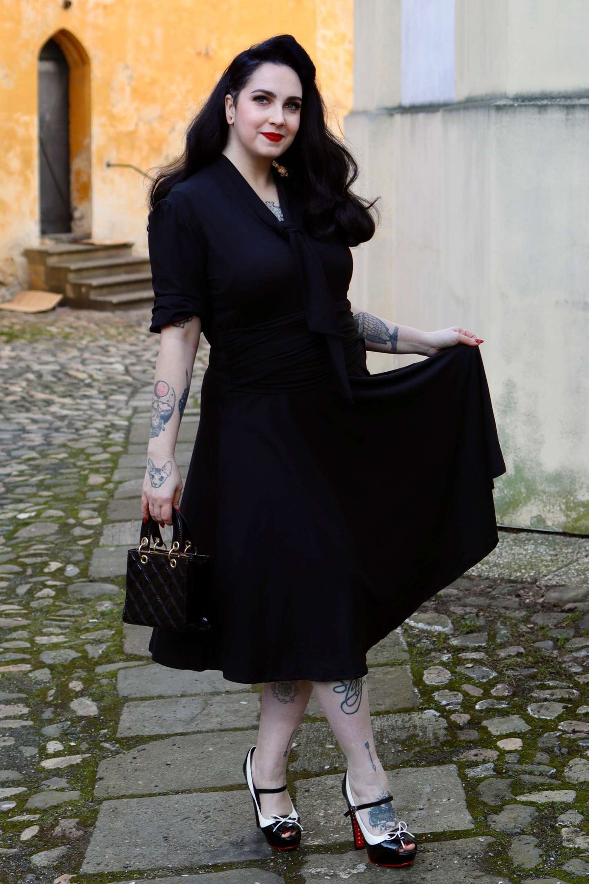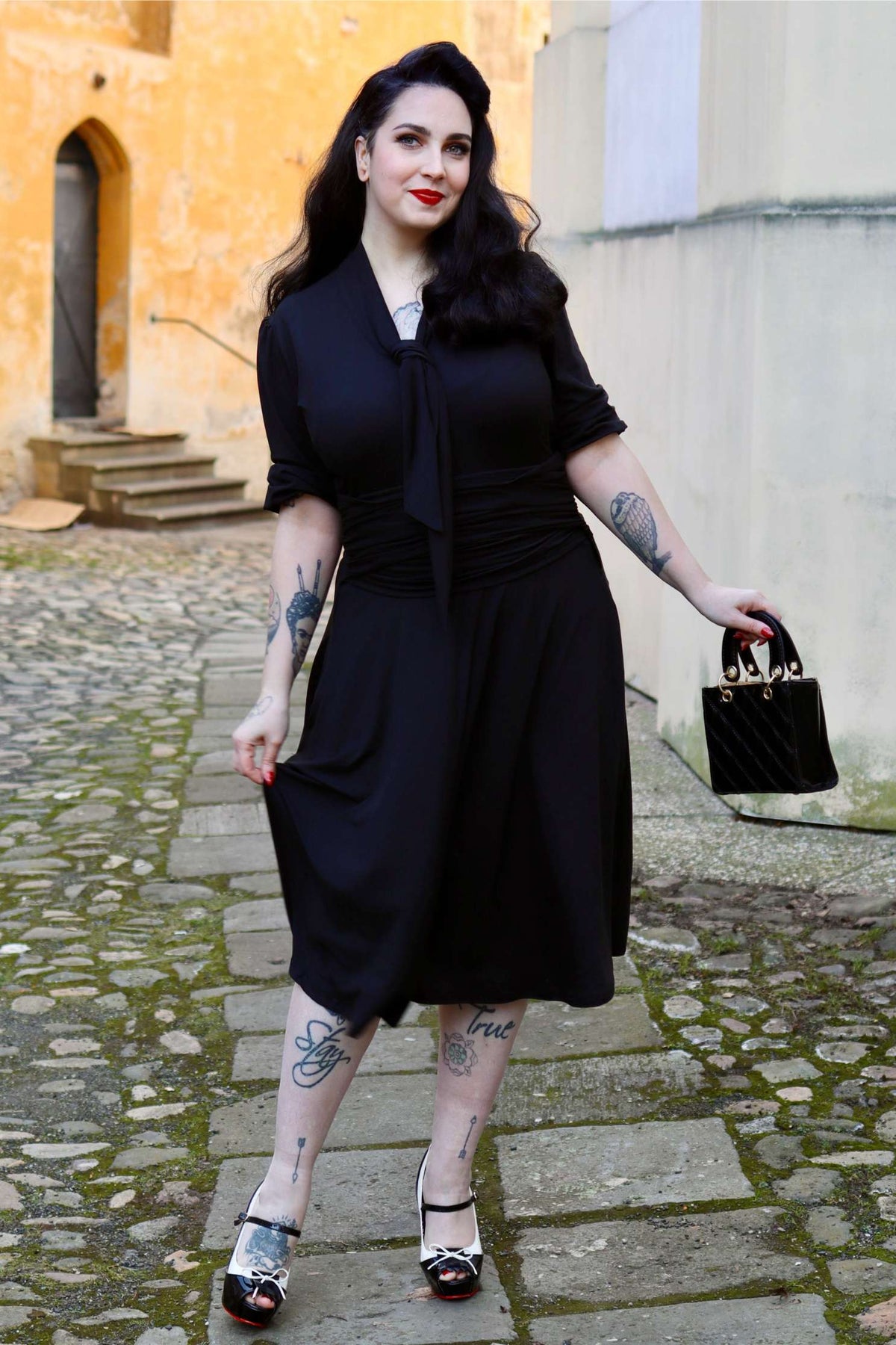 Our Sandra dress captures timeless sophistication with a touch of vintage flair. Featuring a graceful bow tie neckline, flattering ruched waist detail, and comfy three-quarter balloon sleeves, it’s designed to highlight your feminine silhouette with effortless charm. The flared skirt creates a classic 1950s-inspired shape, perfect for any occasion - from afternoon tea to evening gatherings. Finished with a concealed side zip for easy reach and hidden pockets, it’s the perfect balance of style and function.