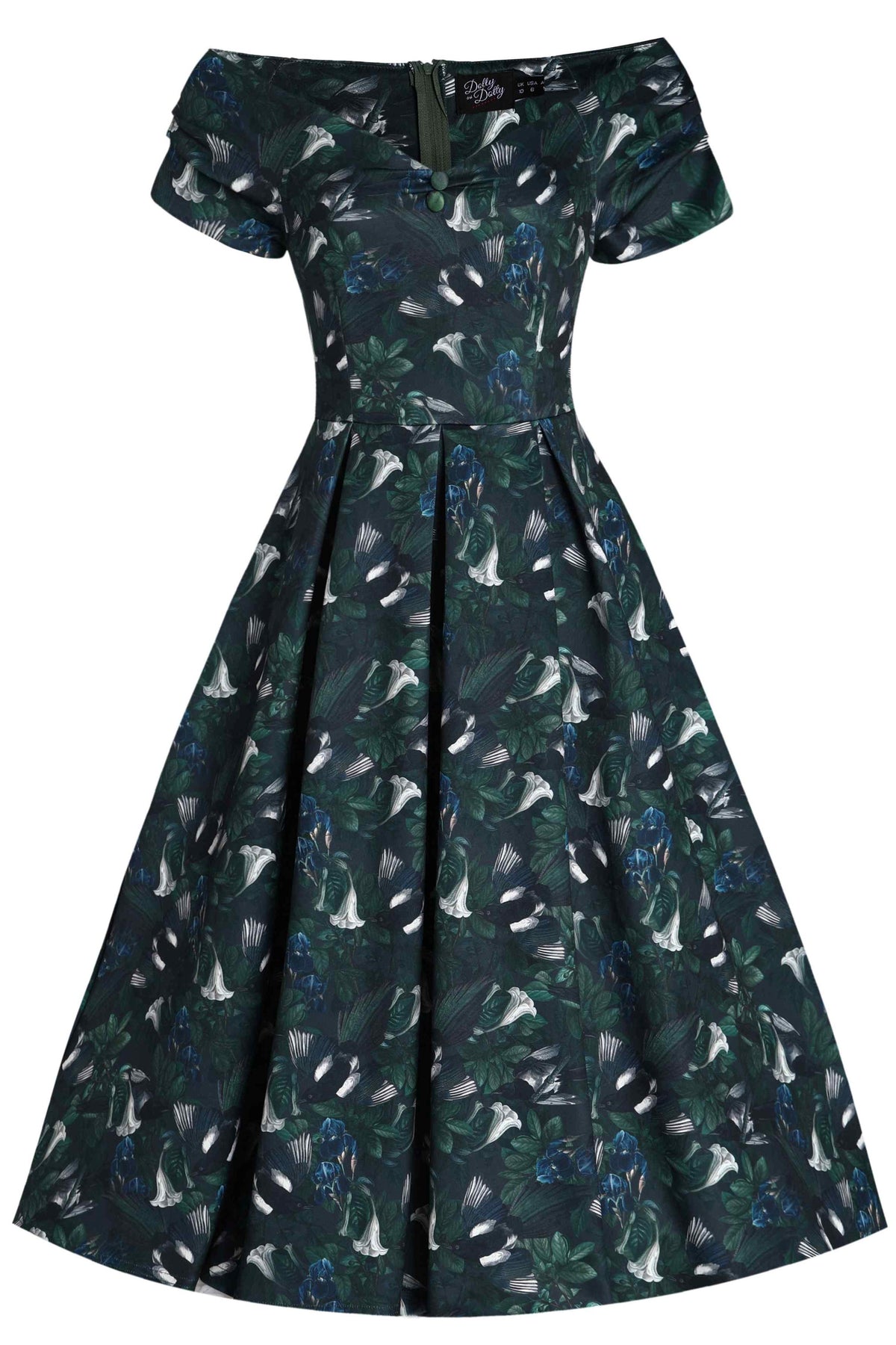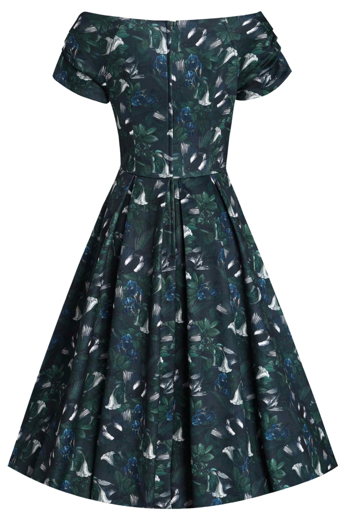 Lily Dark Green Off Shoulder Dress In Magpie Print