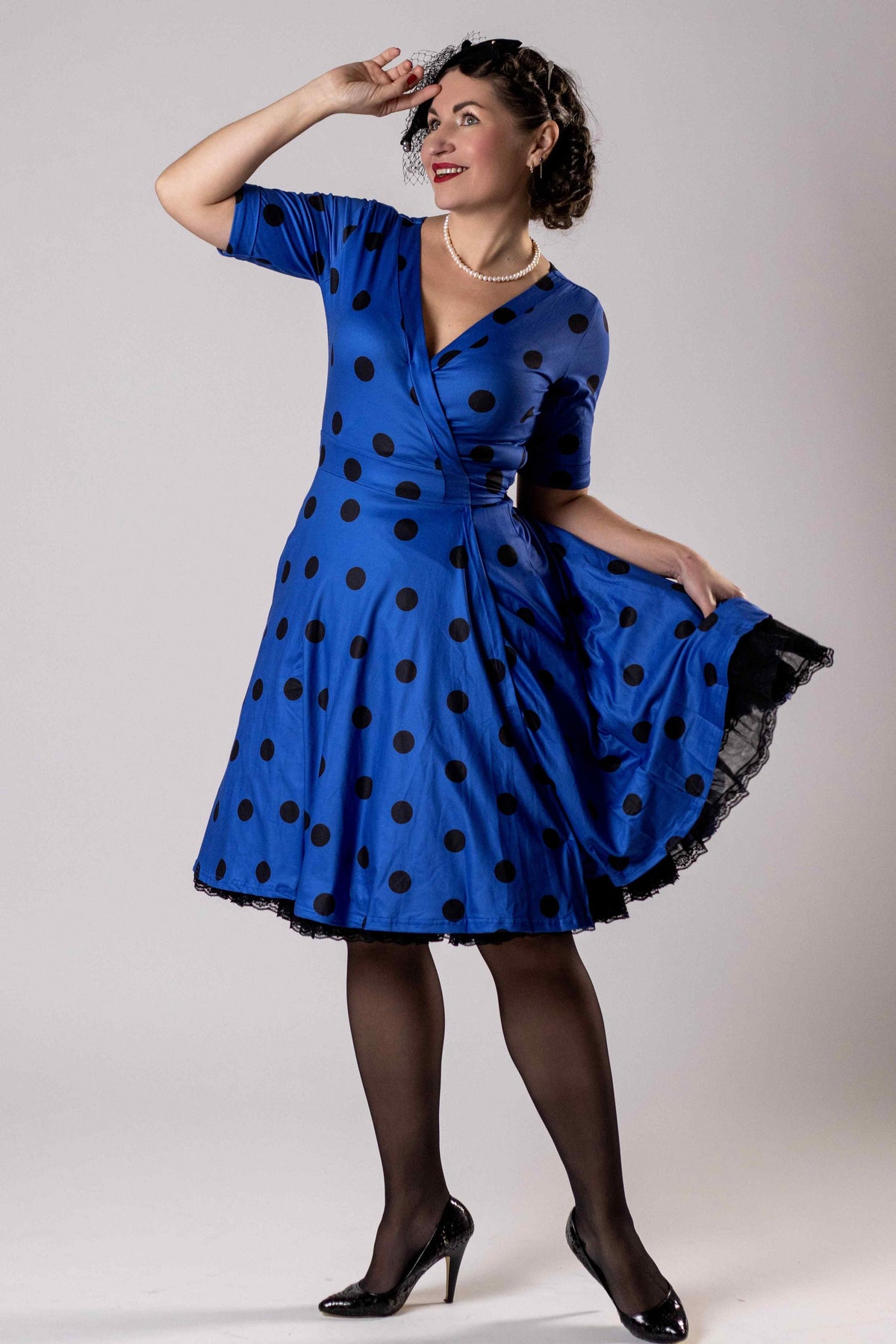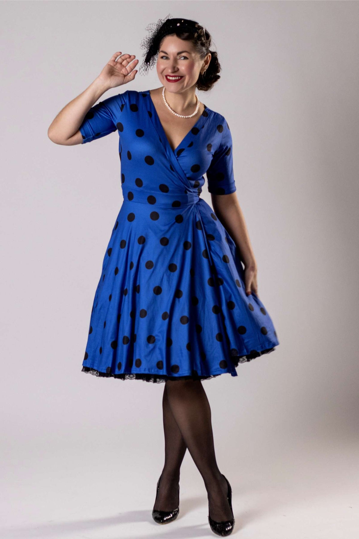 A model wearing a Matilda Royal Blue Polka Dot Wrap Dress