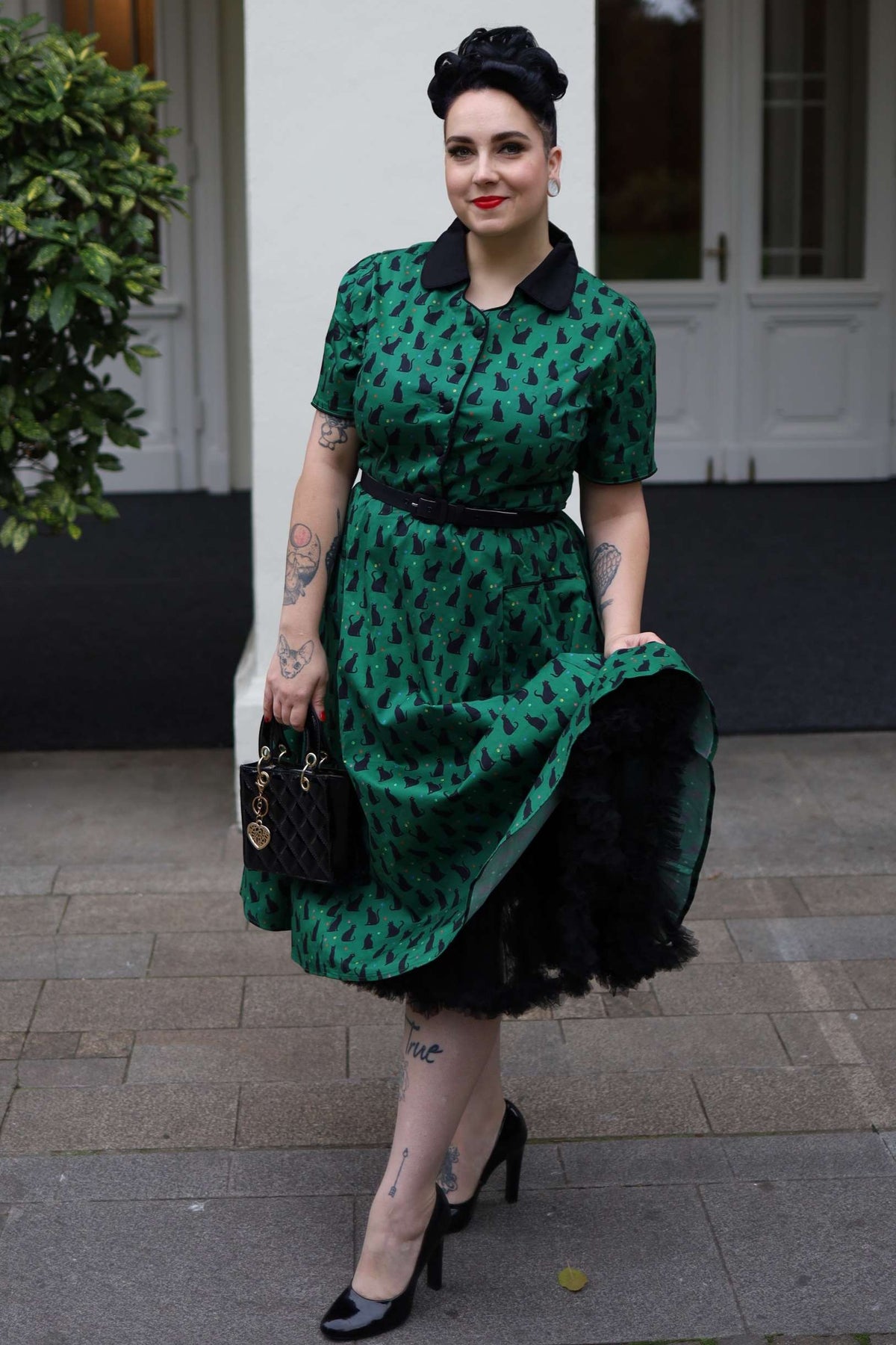 Step into the timeless elegance of the 50s with our Mabel midi shirt dress. This dress is a true classic, with its retro collared bodice, short sleeves, and a dreamy circle skirt that flows beautifully. Subtle piping on the sleeves and front gives it that special 50s flair. The flattering belt defines your waist, and the concealed side zip ensures a smooth fit.