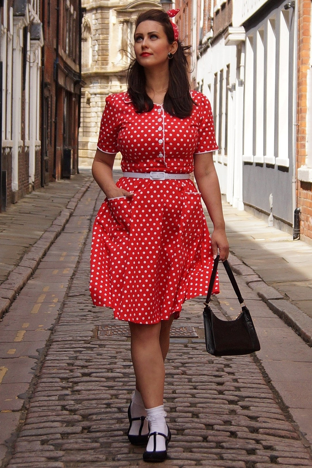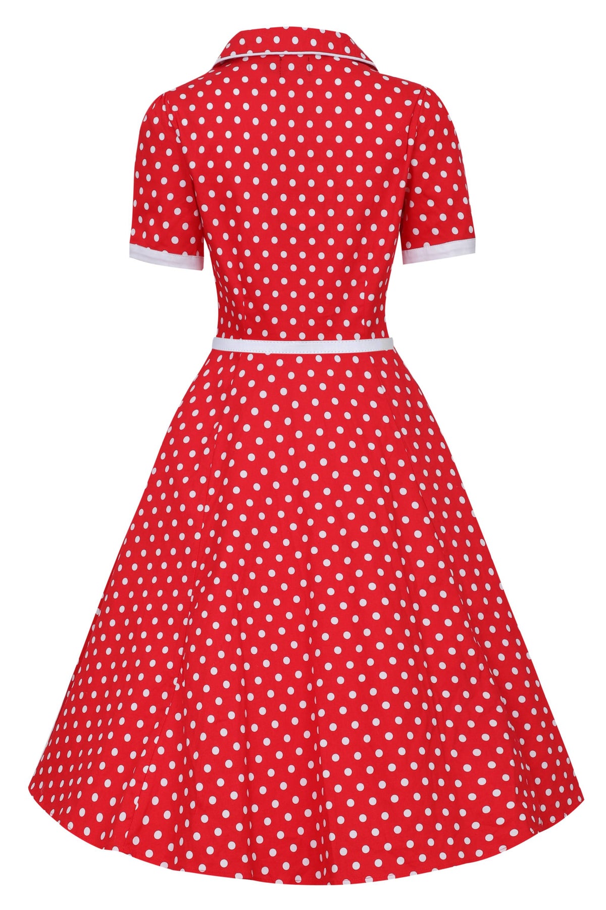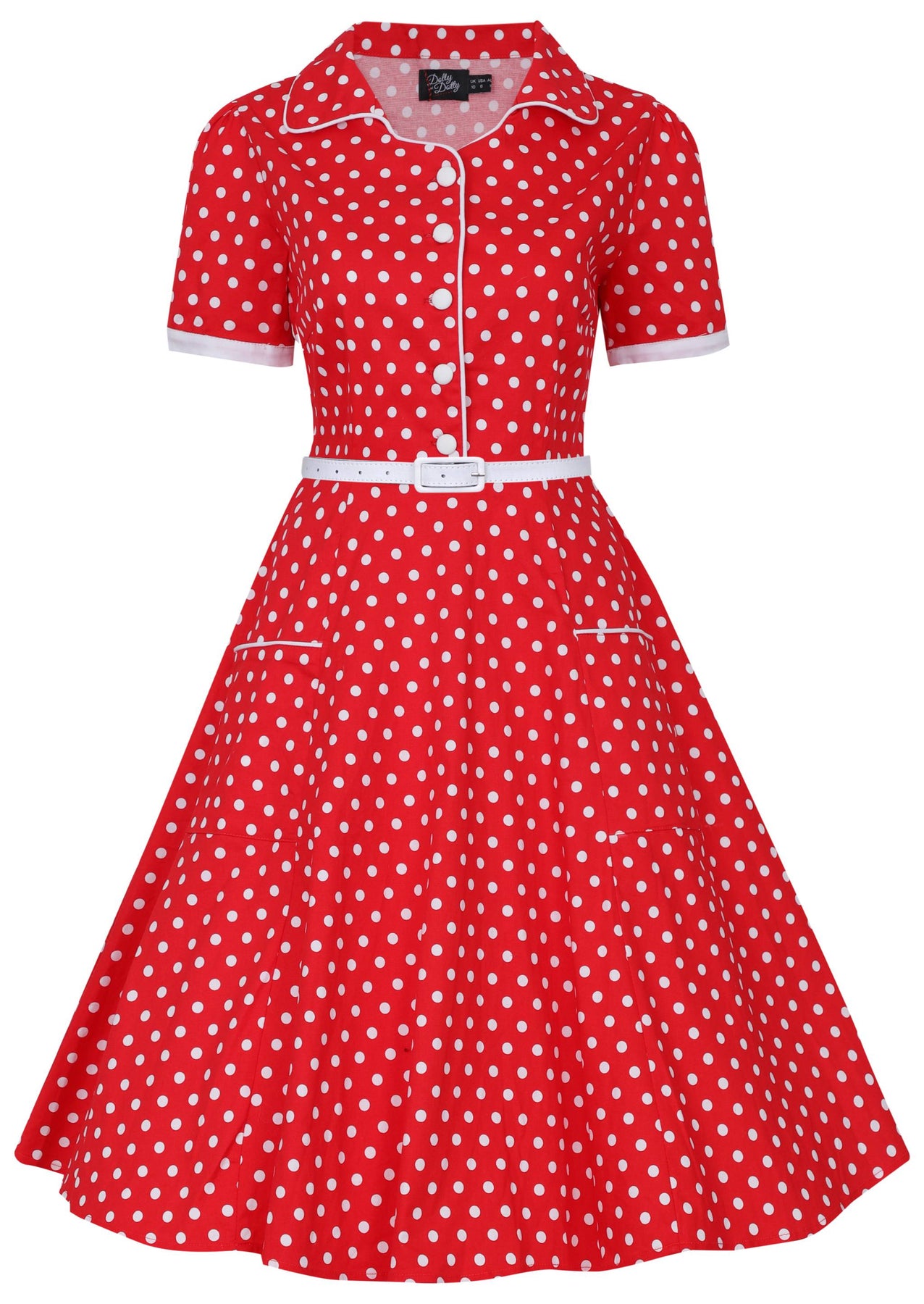 shirt dress has a flattering fitted top with short sleeves, cute buttons, and a retro style collar. The vintage style dress comes with a cute belt and fastens with a concealed side zip and is made from soft cotton with stretch. And guess what? This dress has pockets!