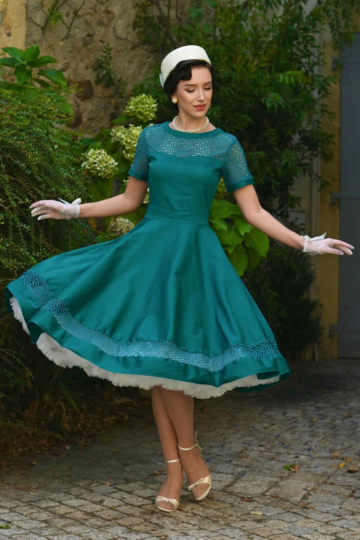 Tess features delicate crochet lace along the neckline and a beautiful lace panel at the skirt’s hem, adding just the right touch of elegance. The fitted waist flatters your shape, while the flared mid-calf skirt gives it a feminine vibe -it's perfect on its own or pair it with one of our petticoats for extra volume and glamour. Made from soft, stretchy cotton, it’s as comfortable as it is stylish, with a hidden zip at the back for a smooth finish.
