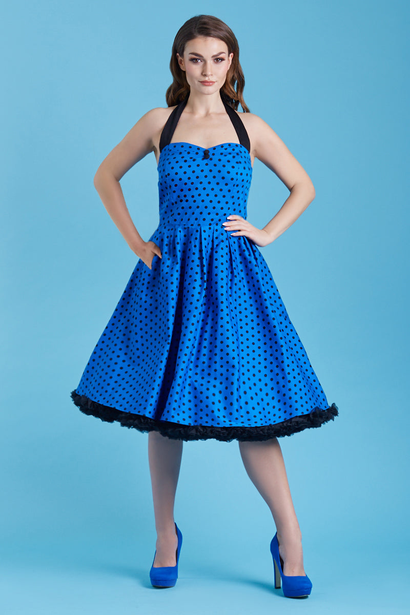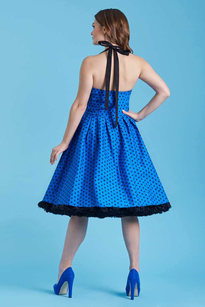 You will be transformed into a rebellious rockabilly chick with our 1950s Sophia swing dress! This fifties frock features an adorable sweetheart neckline, a full 50s style pleated skirt, a halter neck tie and an elasticated back. This classic style is made from lovely soft cotton with stretch.