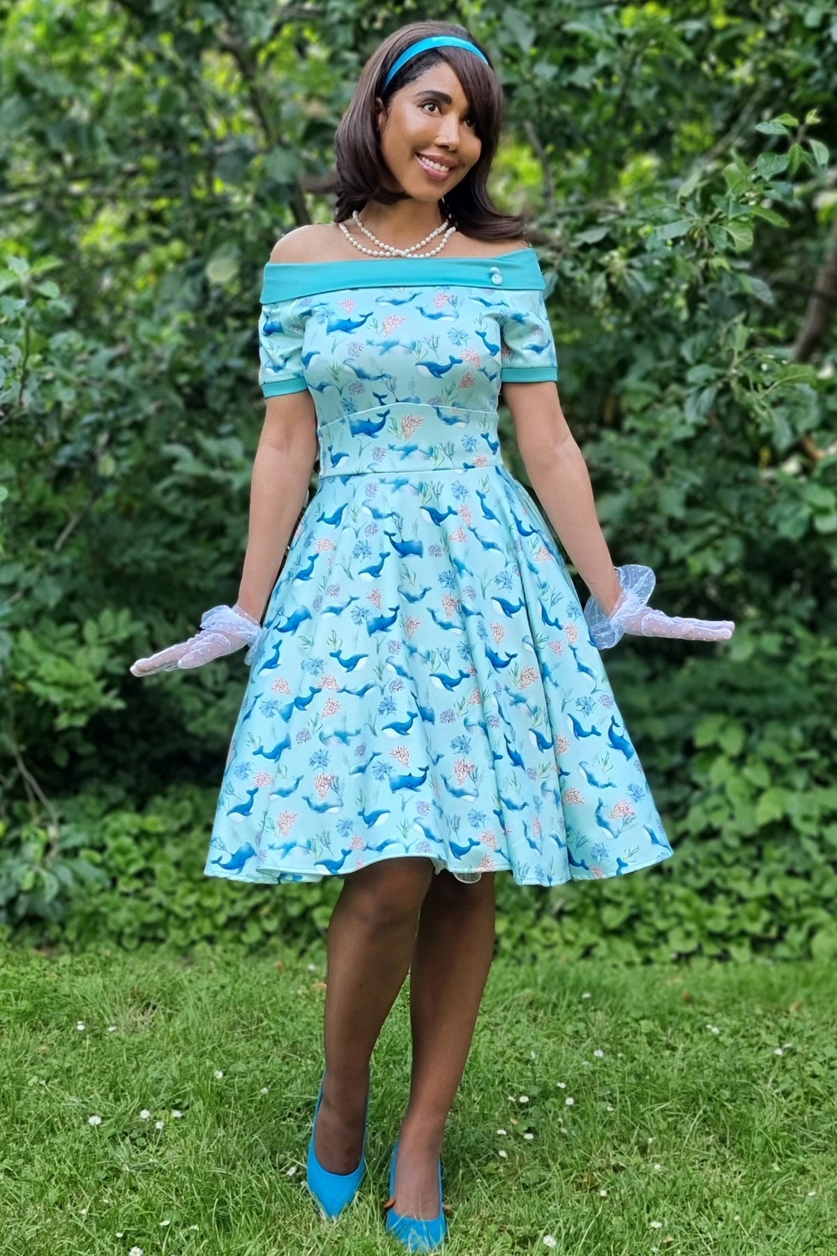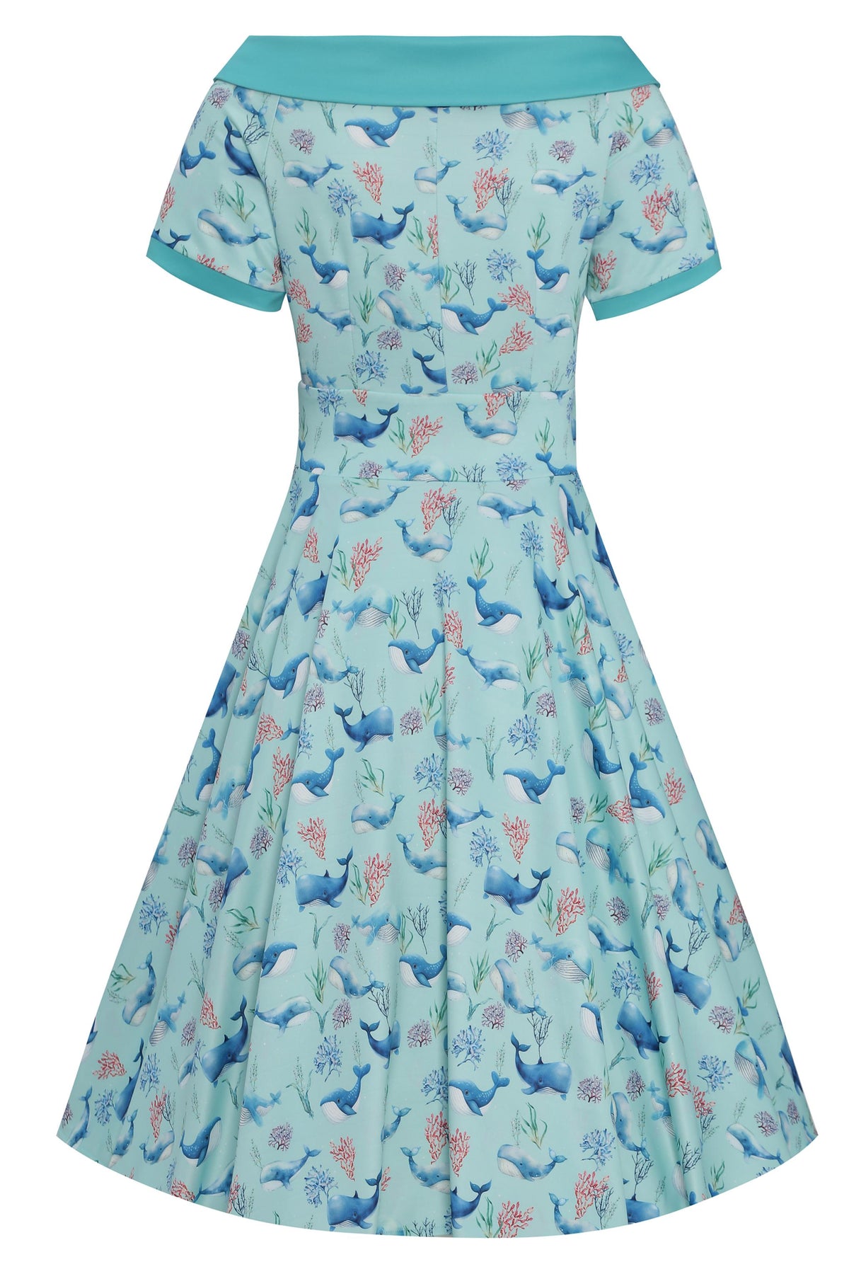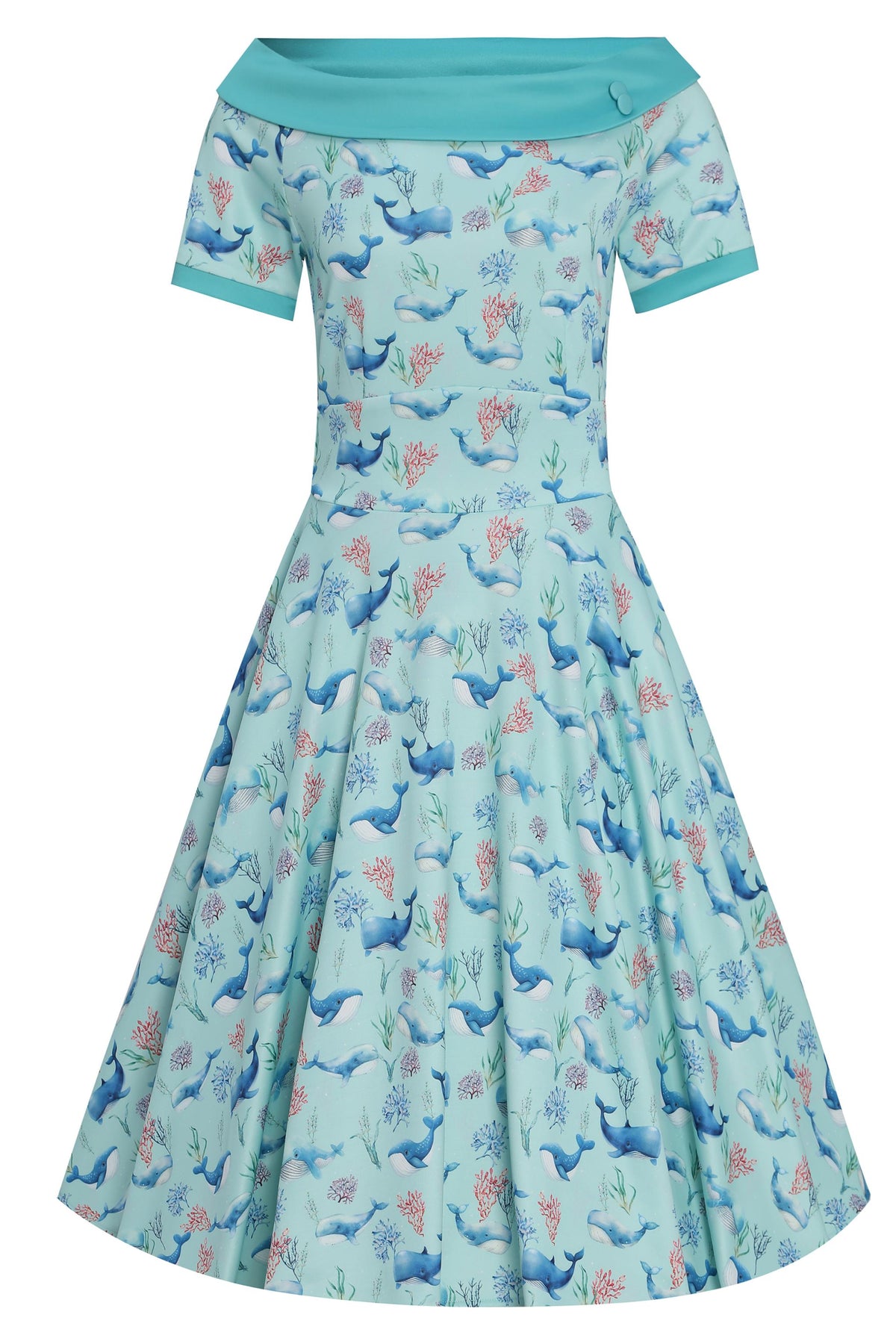A must-have for a vintage peach! The 50s style dress features flattering short sleeves, a wide-fitted waistband, a vintage full-circle skirt, and a vintage off-the-shoulder neckline with matching button detail. This stylish and timeless dress is made from super soft fabric and fastens with a concealed side zip.