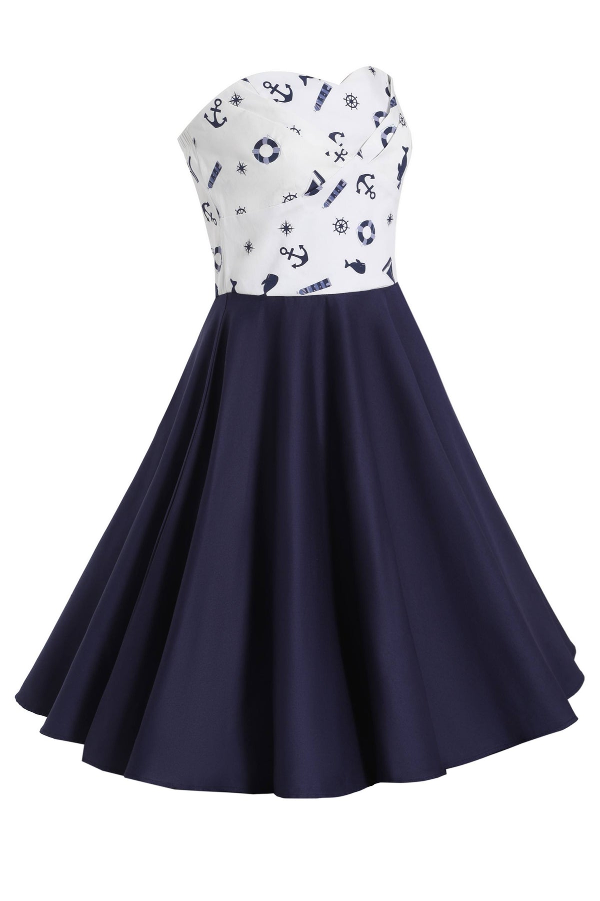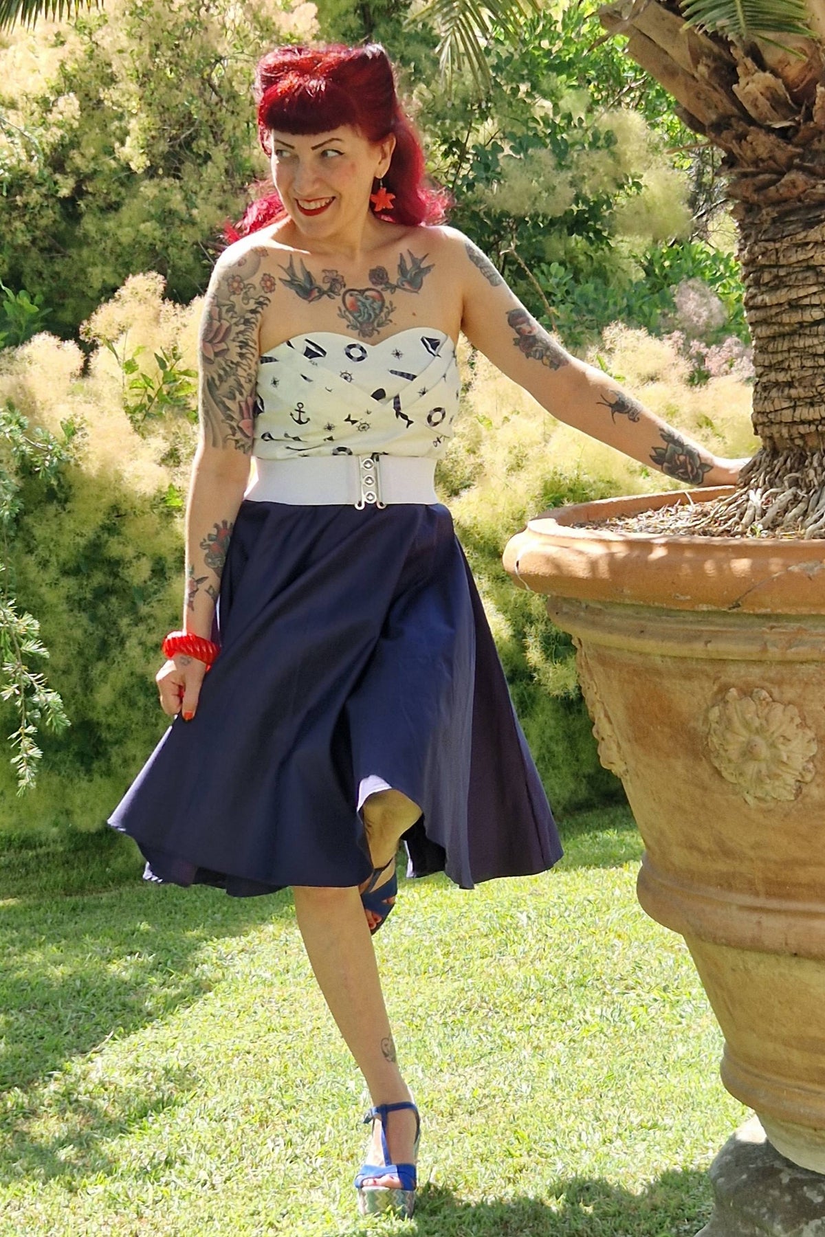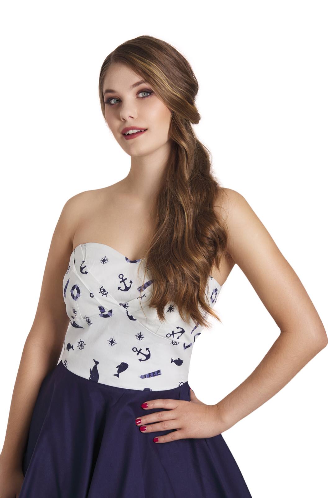 Print: White nautical print top & navy blue skirt