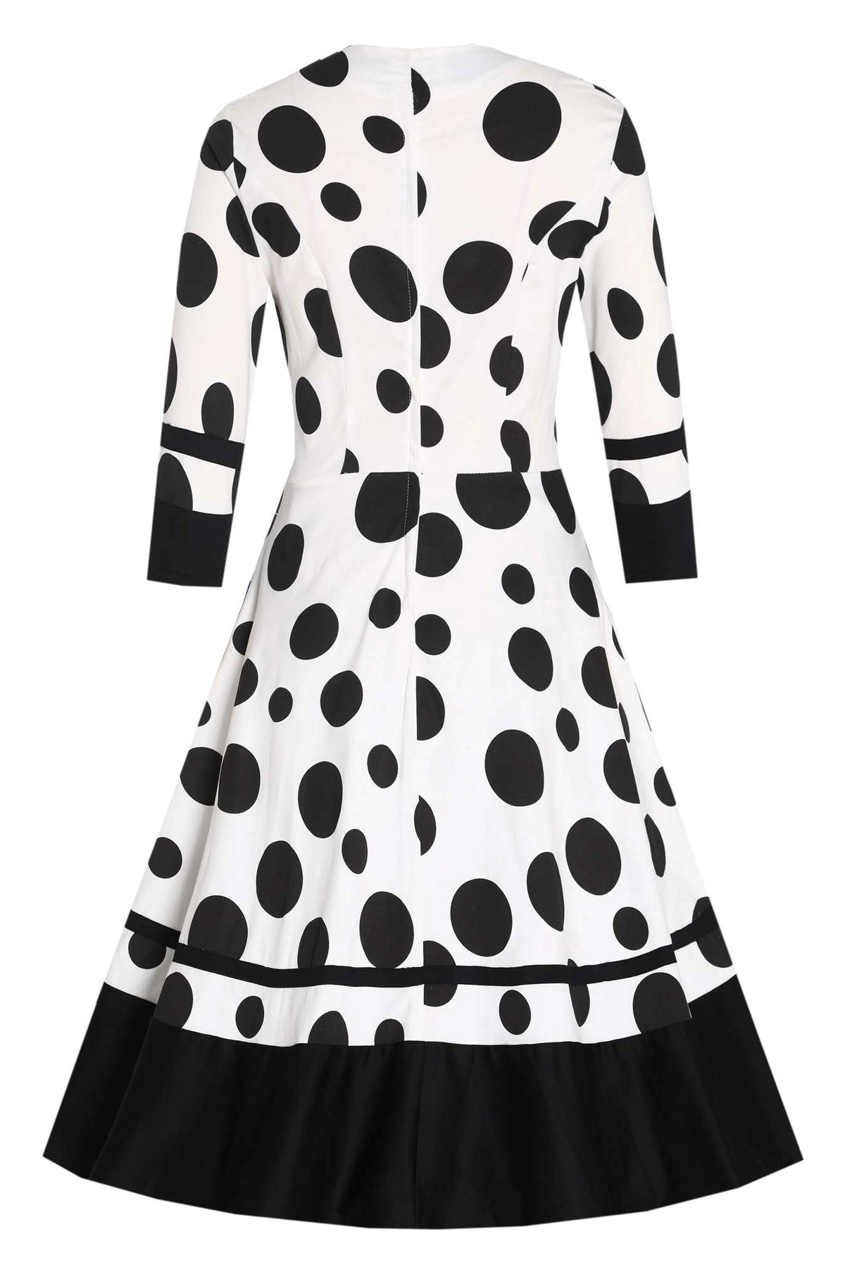 Our Maria dress is a show-stopping statement of vintage glamour. It features a flattering fitted bodice with a horseshoe neckline and elegant three-quarter sleeves. The full flared skirt is accentuated by a contrasting hem that adds a touch of drama and sophistication. Perfectly balancing playful charm and timeless elegance, this dress also includes a concealed back zip for a seamless fit and hidden side pockets for your essentials. Pair it with one of our petticoats to elevate the volume and create the ultimate retro silhouette.