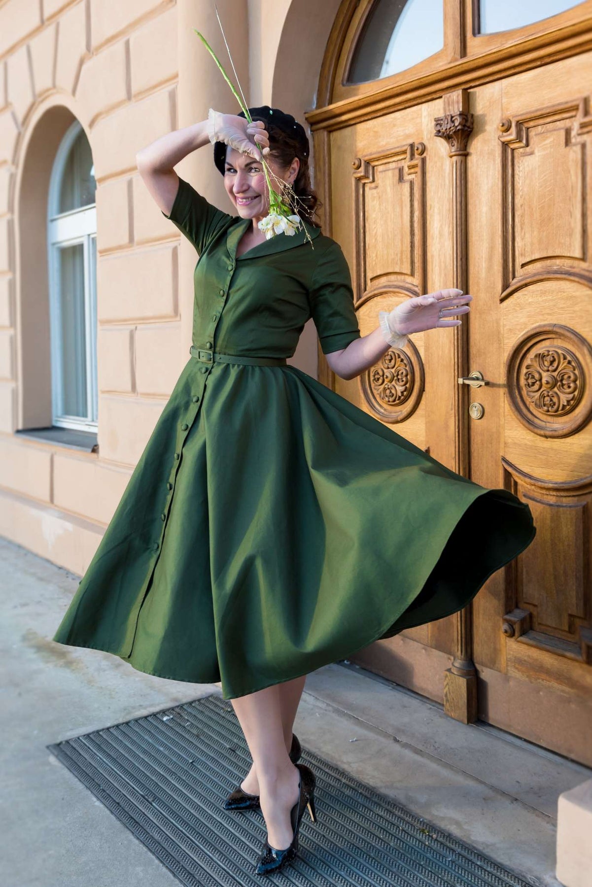 The Mollie shirt dress is a classic style inspired by the 1950s vibes with a modern twist. Its full circle skirt, not just flared, but a true full sweep, creates dramatic, elegant flow with every step. It falls to a graceful mid-calf length and features hidden pockets for extra ease. Made from soft cotton with generous stretch, it’s as comfortable as it is elegant. Finished with a shawl collar, above-elbow sleeves, and a button-down front, the Mollie is effortlessly refined and designed to move beautifully with you.