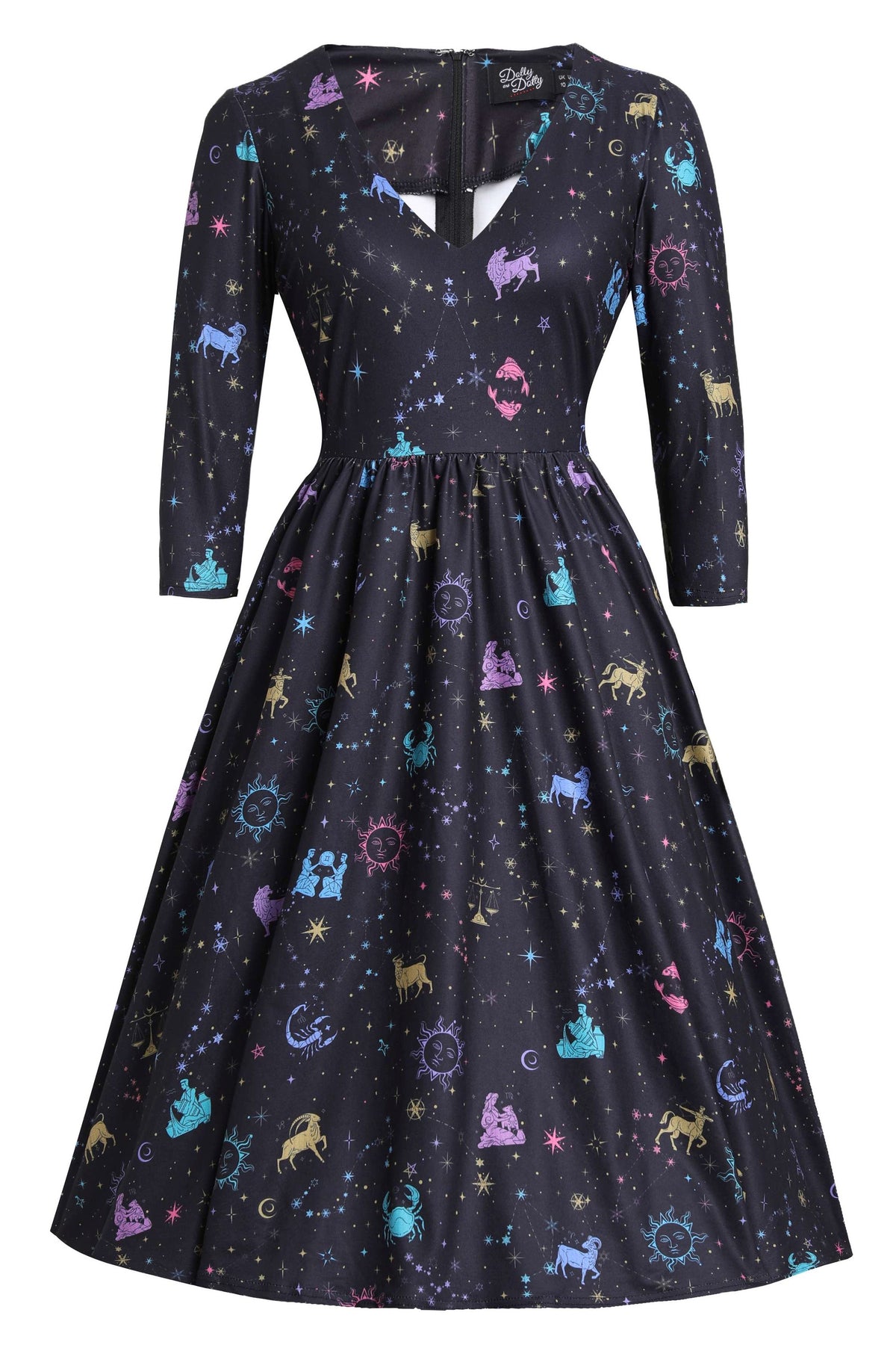 Bring a touch of whimsy to your wardrobe with this delightful dress. The 3/4 sleeves provide just the right amount of coverage, while the gathered waistline accentuates your figure, creating a lovely silhouette that is both flattering and comfortable. The below-the-knee length is perfect for any occasion. The A-line, flared skirt adds movement and grace to your every step, ensuring you'll turn heads wherever you go.