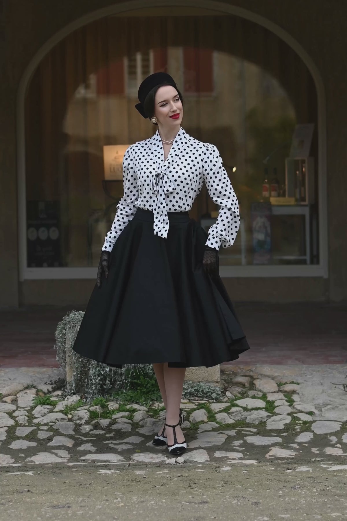 The Margaret blouse is the perfect blend of vintage charm and everyday sophistication. Designed with a flattering fit, it features a feminine bow tie neckline that adds a graceful retro touch. The long sleeves are finished with neat cuffs, while the button-down front makes it easy to style with both skirts and trousers. Effortlessly versatile, this timeless blouse transitions seamlessly from workday polish to evening elegance.