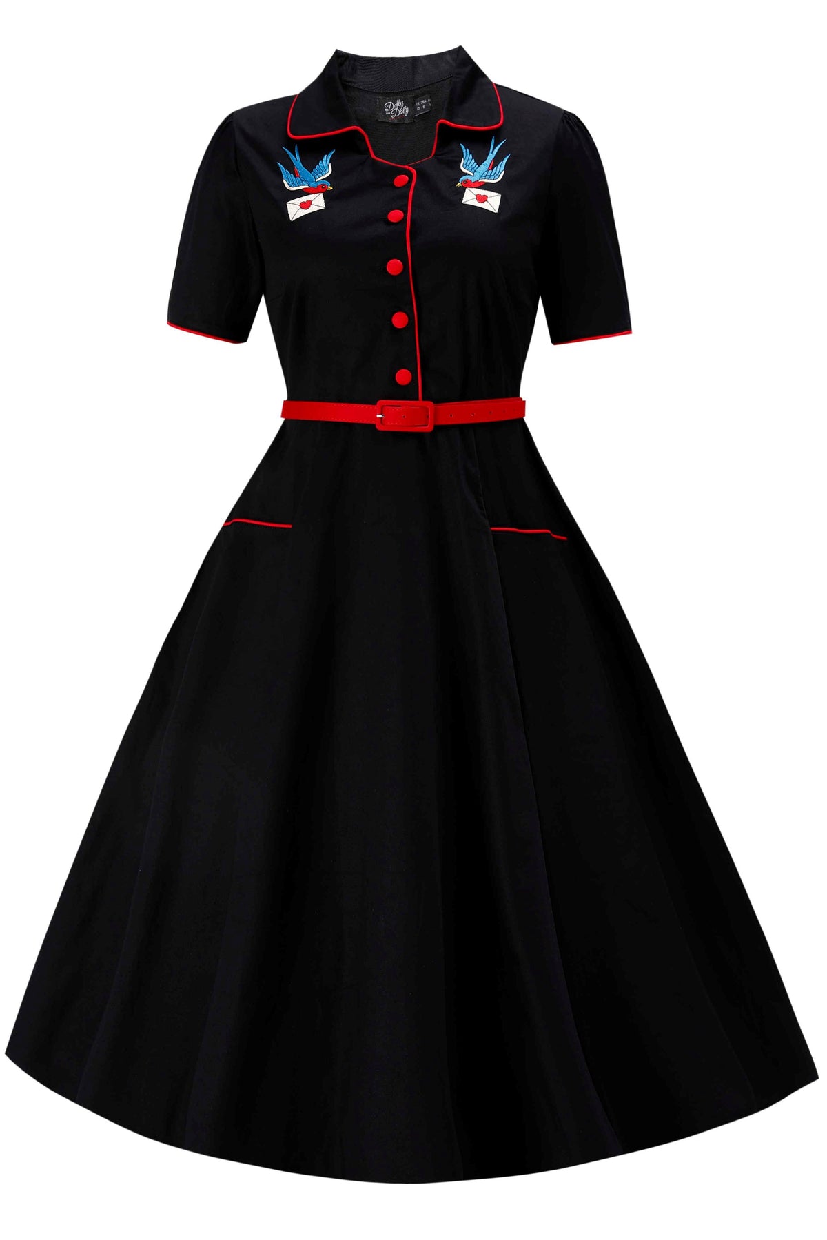 Mabel Rockabilly Midi Shirt Dress With Swallow Embroidery