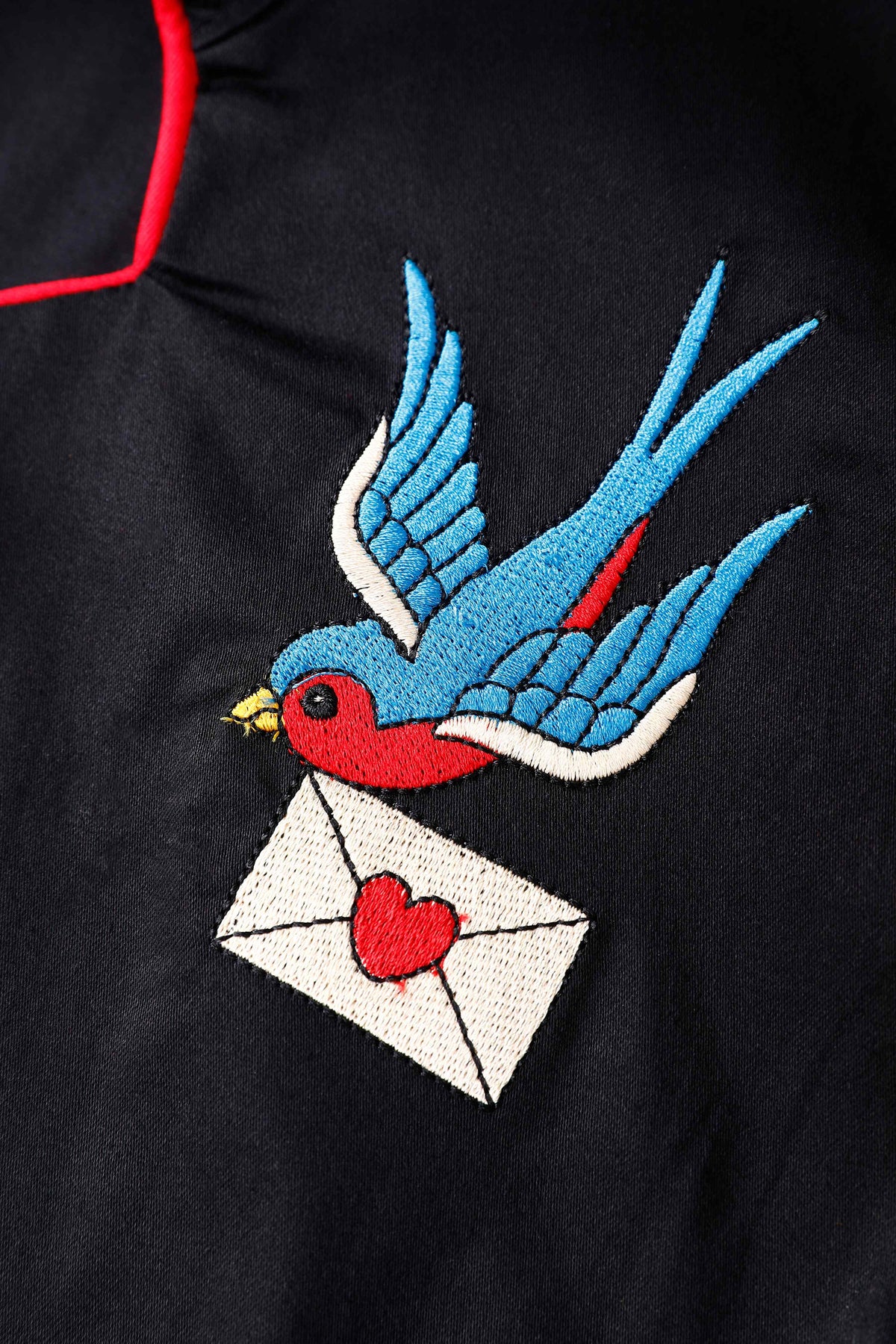 Close up view of Mabel Rockabilly Midi Shirt Dress With Swallow Embroidery