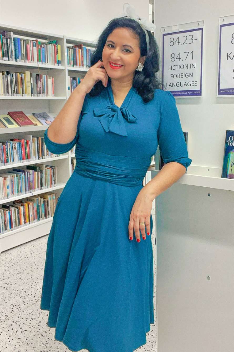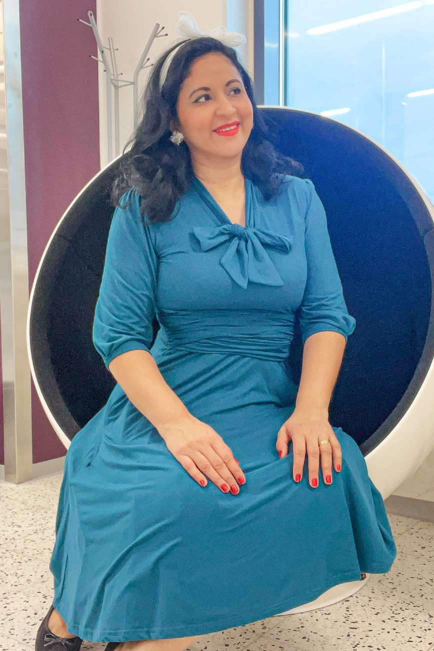 Our Sandra dress captures timeless sophistication with a touch of vintage flair. Featuring a graceful bow tie neckline, flattering ruched waist detail, and comfy three-quarter balloon sleeves, it’s designed to highlight your feminine silhouette with effortless charm. The flared skirt creates a classic 1950s-inspired shape, perfect for any occasion - from afternoon tea to evening gatherings. Finished with a concealed side zip for easy reach and hidden pockets, it’s the perfect balance of style and function.