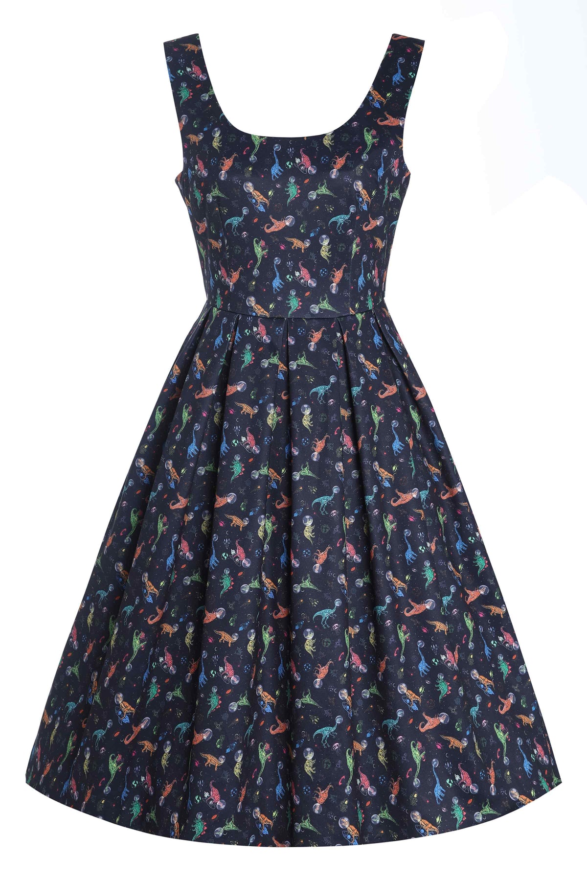 Step into a world of whimsy and fun with this Amanda dress! Designed with a flattering fitted bodice and a simple scoop neckline at the front and back, this retro-style dress is tailored to accentuate your curves in all the right places. The 50s swinging skirt with box pleats adds a touch of vintage charm, while the concealed zip at the back ensures a seamless fit. And guess what? This dress has pockets! You can now carry your essentials with ease without compromising on style.