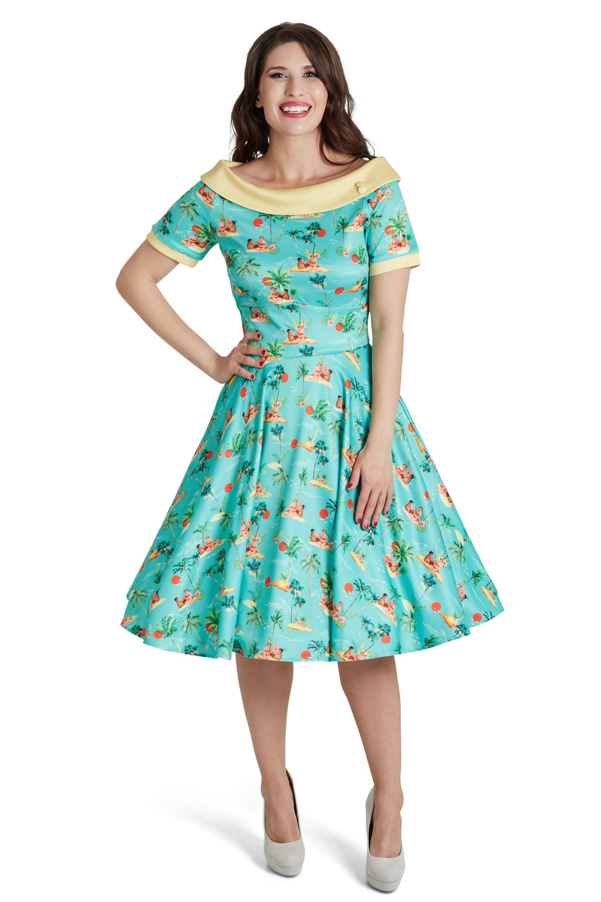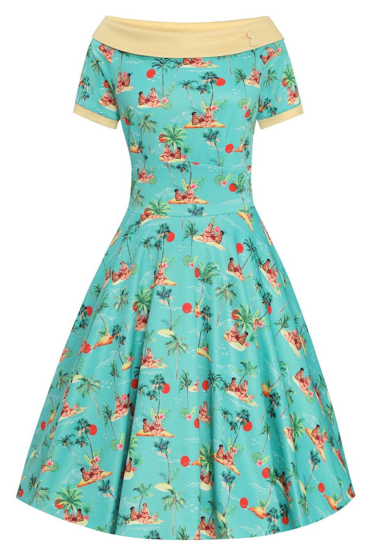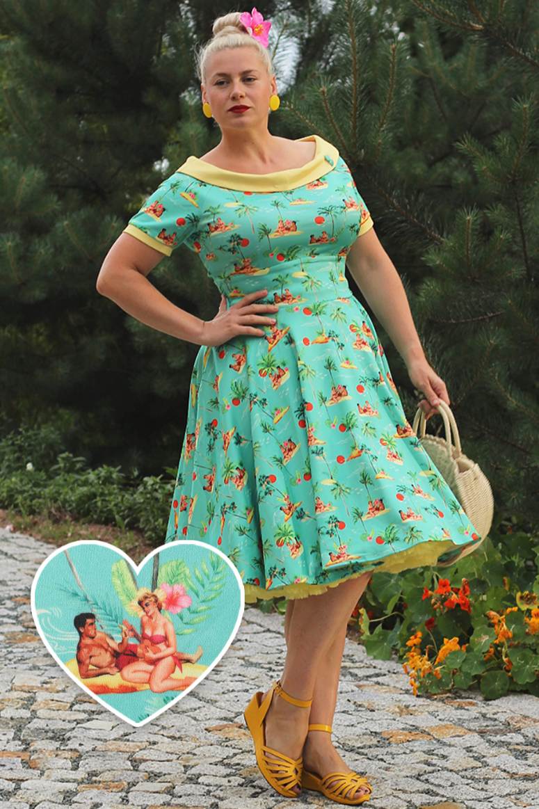 A must-have for a vintage peach! The 50s style dress features flattering short sleeves, a wide-fitted waistband, a vintage full-circle skirt, and a vintage off-the-shoulder neckline with matching button detail. This stylish and timeless dress is made from super soft fabric and fastens with a concealed side zip.