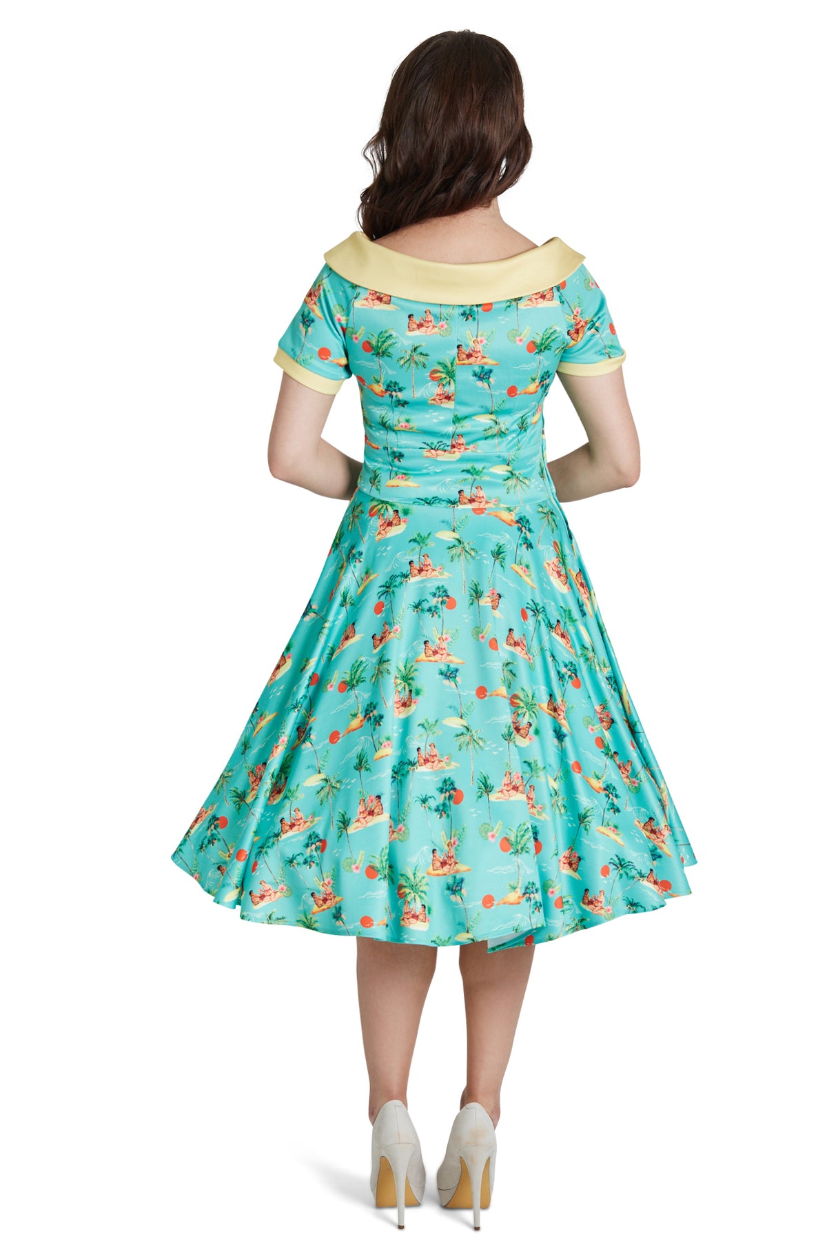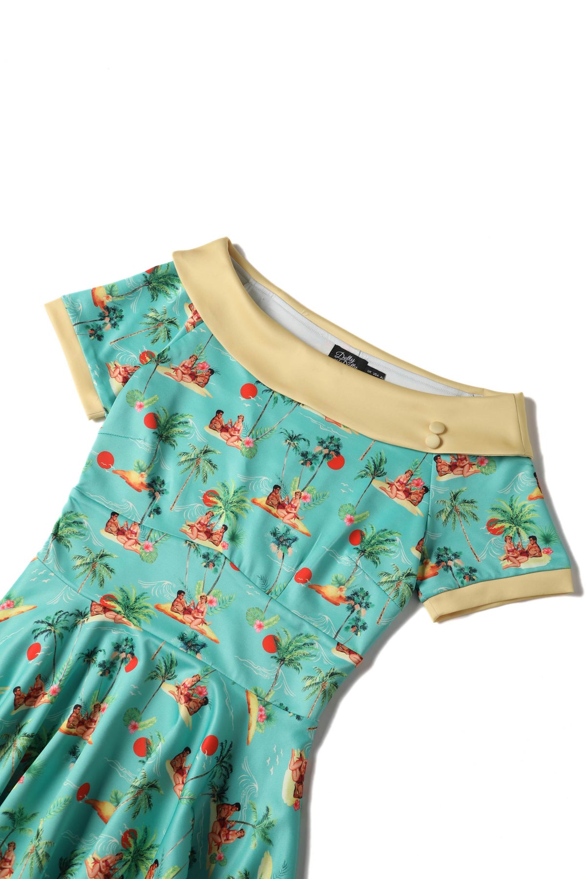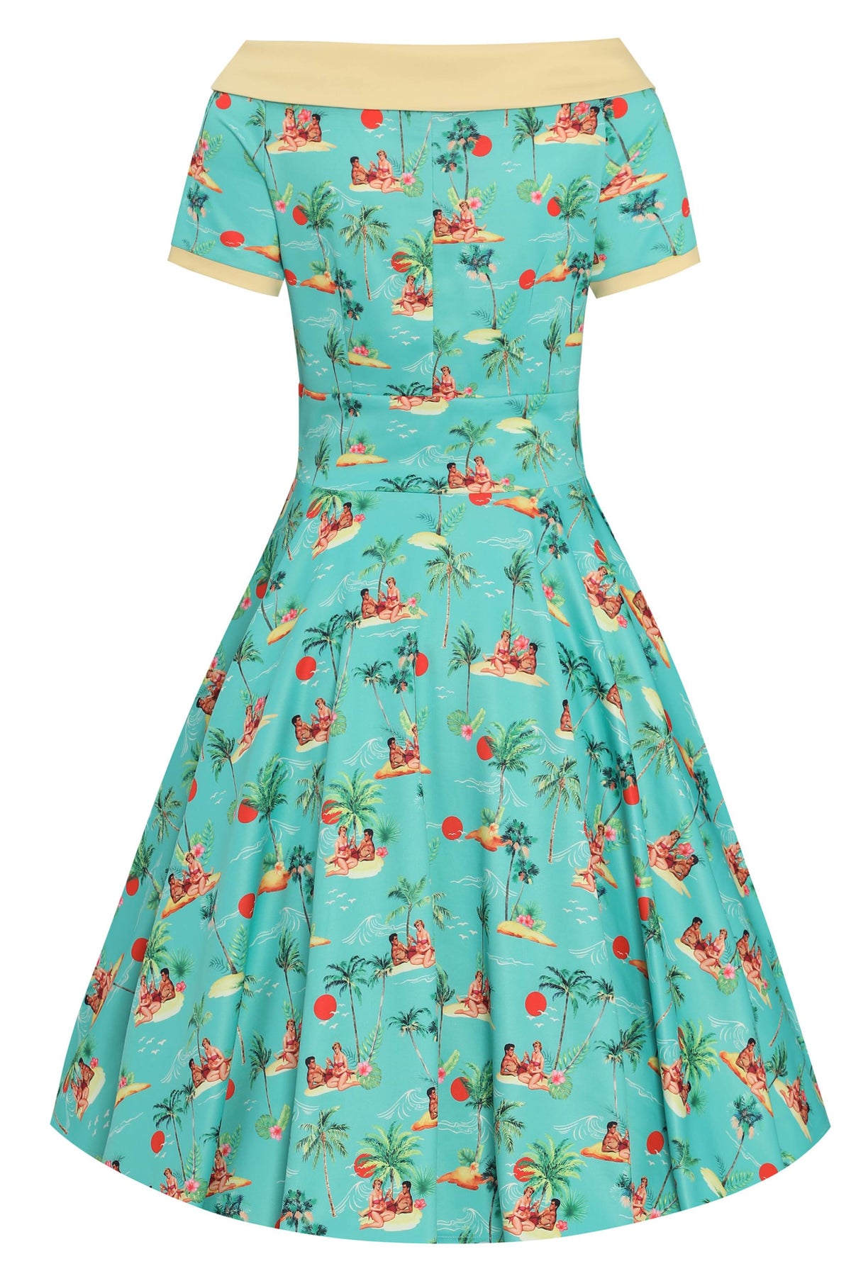 A must-have for a vintage peach! The 50s style dress features flattering short sleeves, a wide-fitted waistband, a vintage full-circle skirt, and a vintage off-the-shoulder neckline with matching button detail. This stylish and timeless dress is made from super soft fabric and fastens with a concealed side zip.