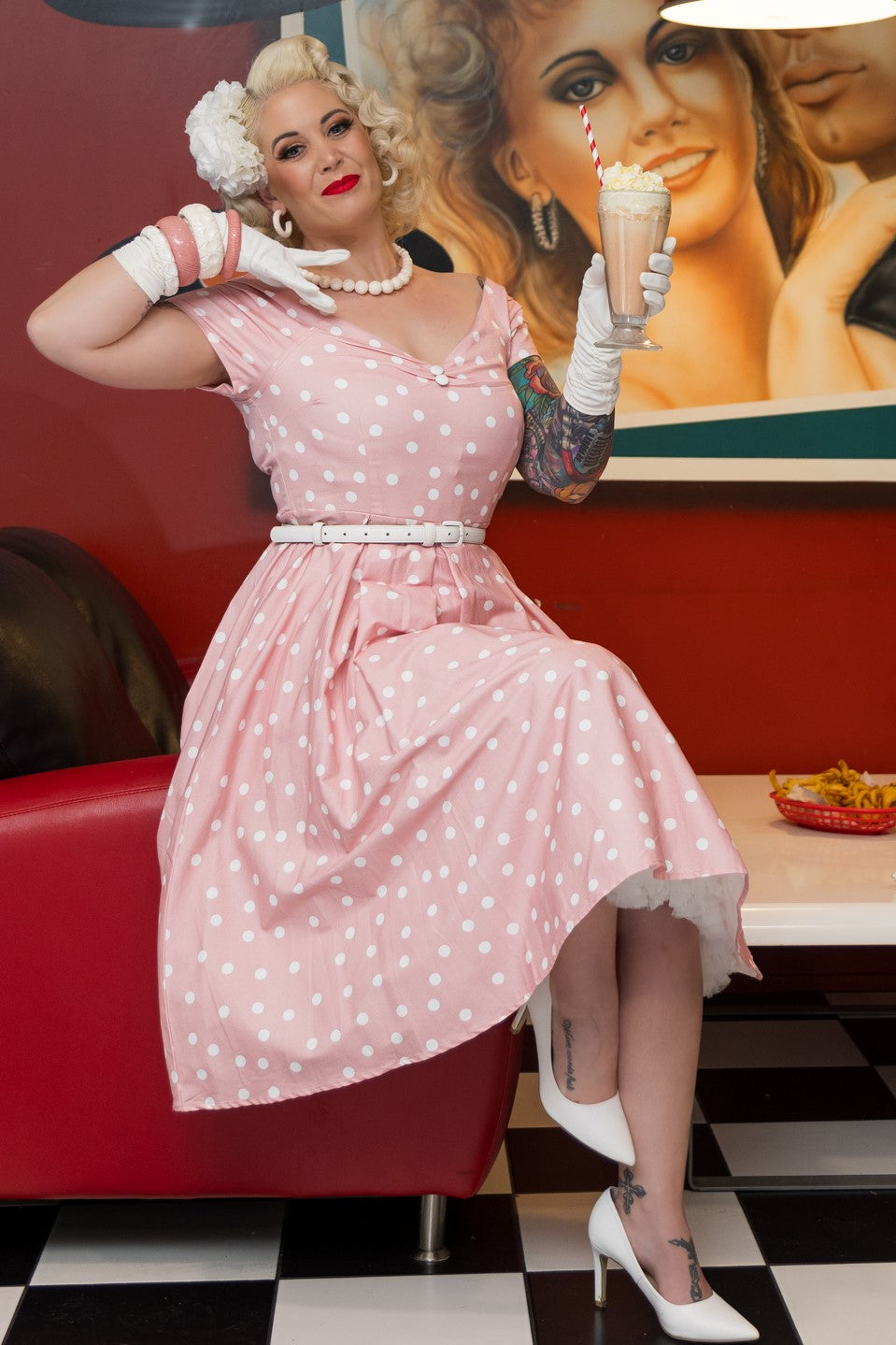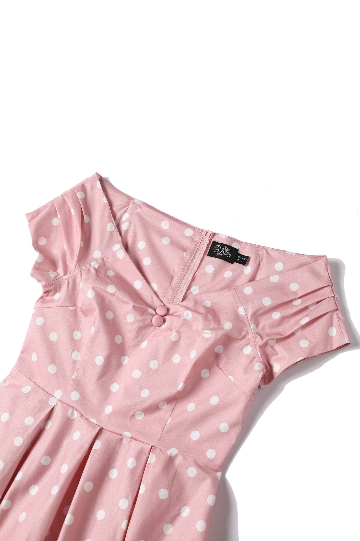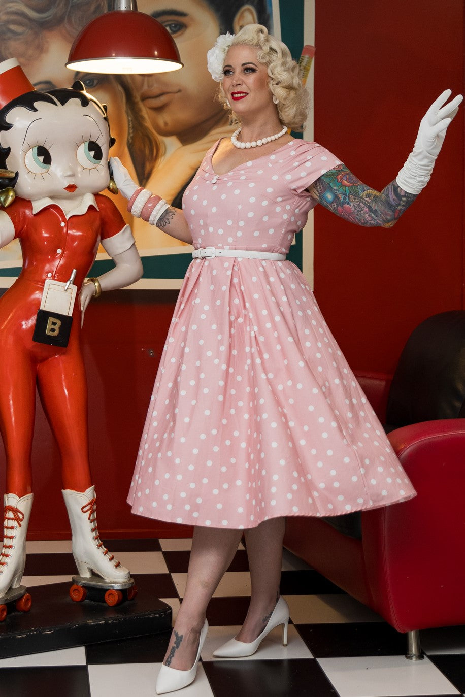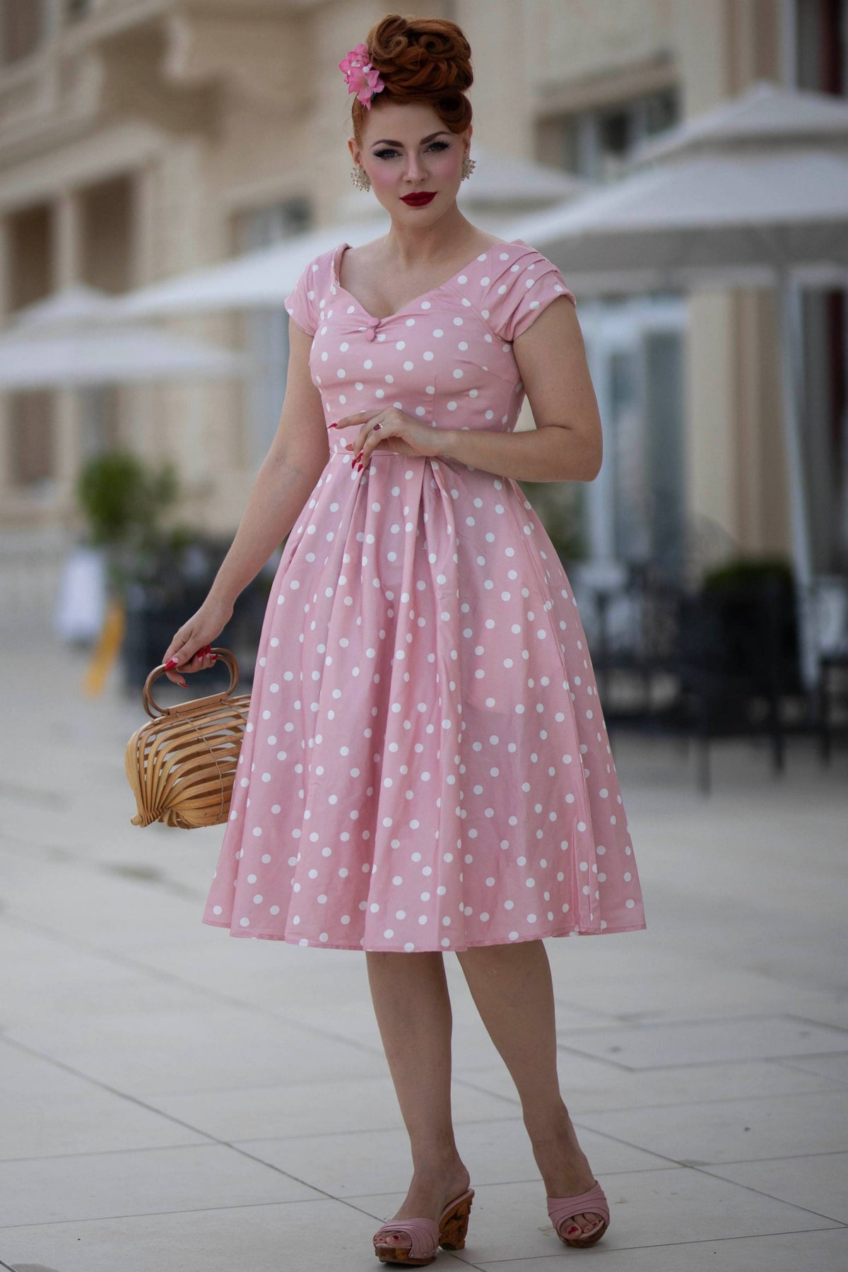 Make an entrance with this 50s-inspired dress that emphasizes your shoulders. The fitted skirt and alluring off-shoulder neckline will have you looking like a dream. Our gorgeous swing dress with short sleeves, a sweetheart neckline, a pretty gathered bust with button detail, a flattering fitted waist, and a 50s style pleated, full circle skirt. Made from lovely soft cotton with light stretch, this seductive style fastens at the back with a hidden zip. And it has pockets!