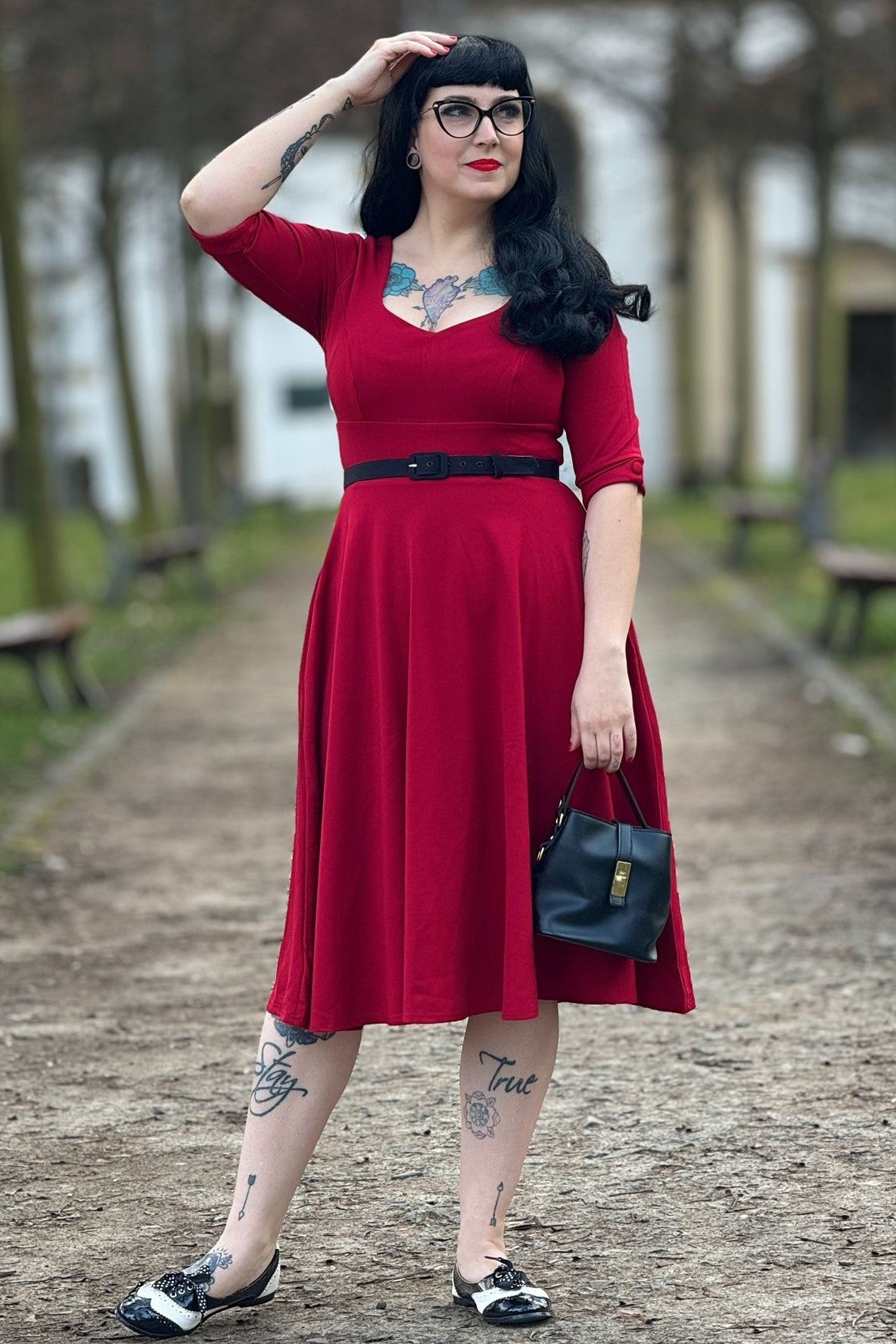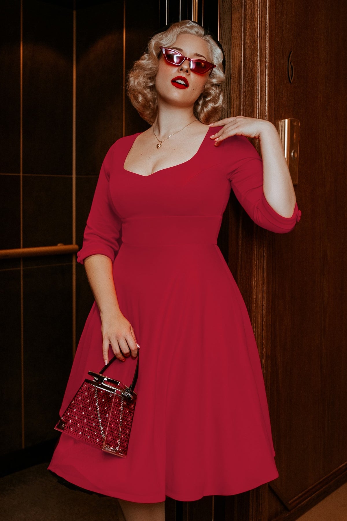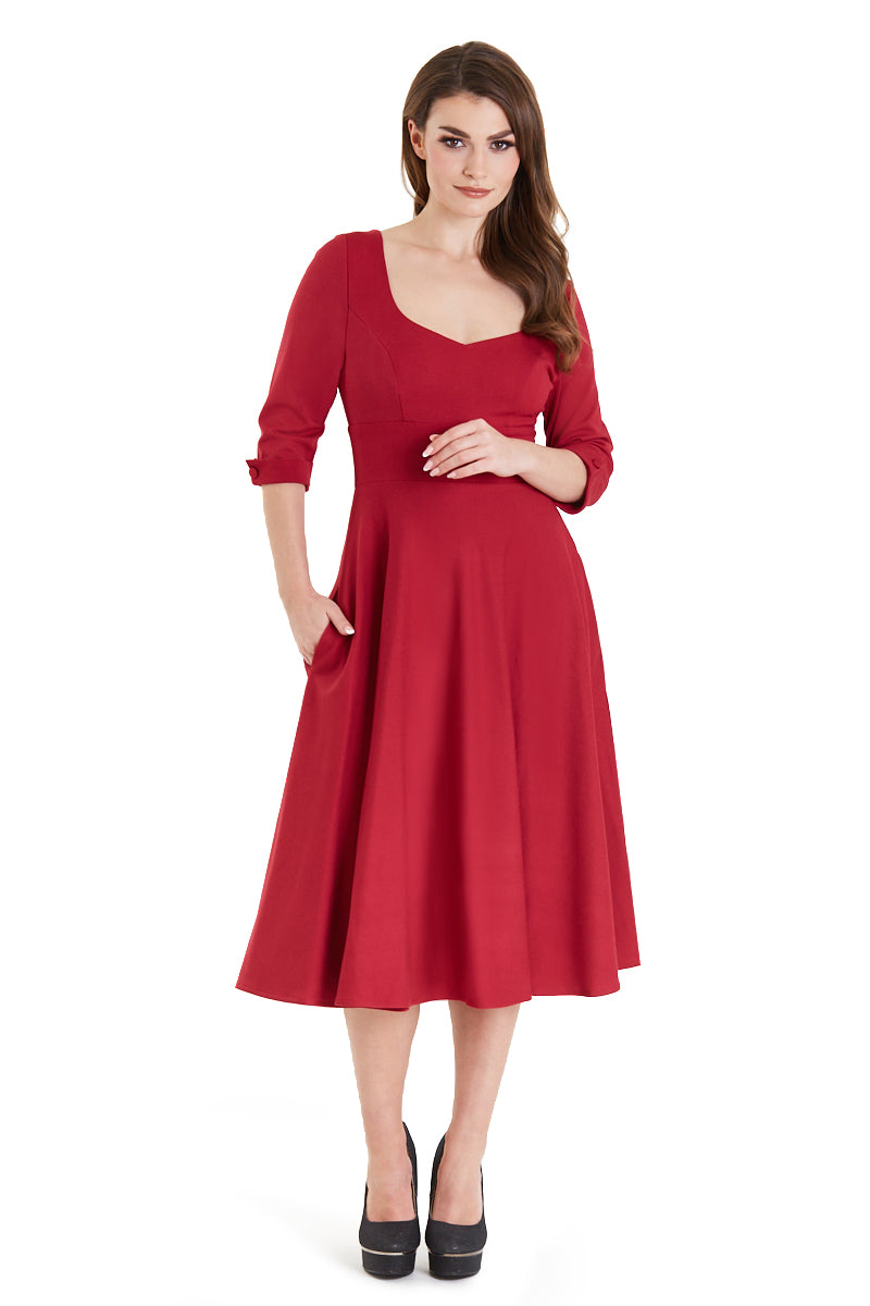 So comfortable & stretchy! Our Scarlette dress is a must have in your wardrobe. This style features a fitted bodice, a sweetheart neckline, 3/4 long sleeves and - of course - our classic a-line skirt with hidden side pockets and a hidden back zip. The pockets are large enough for your mobile phone and purse! Style it for a chic look or pump it up with one of our soft & fluffy petticoats.