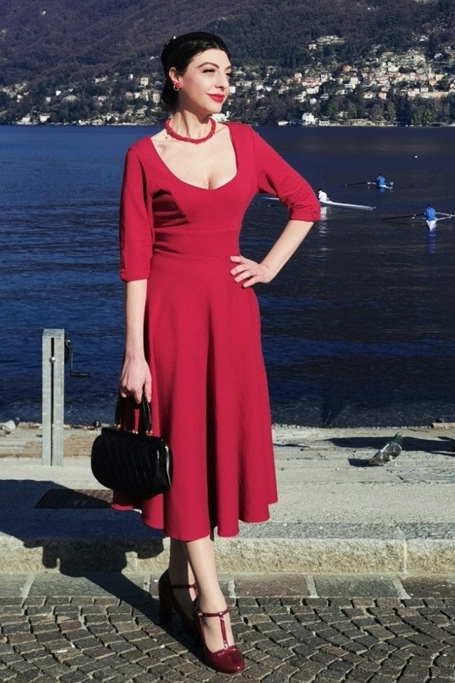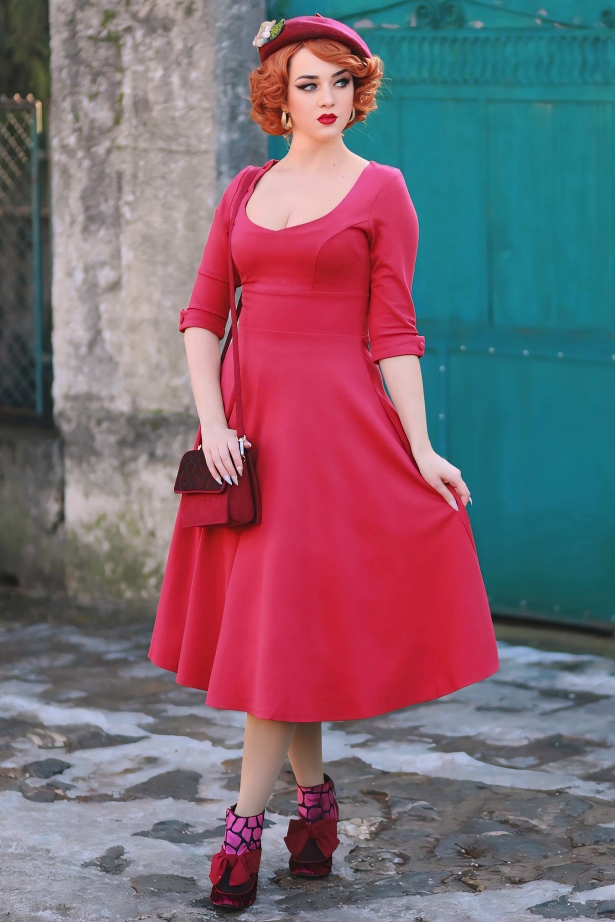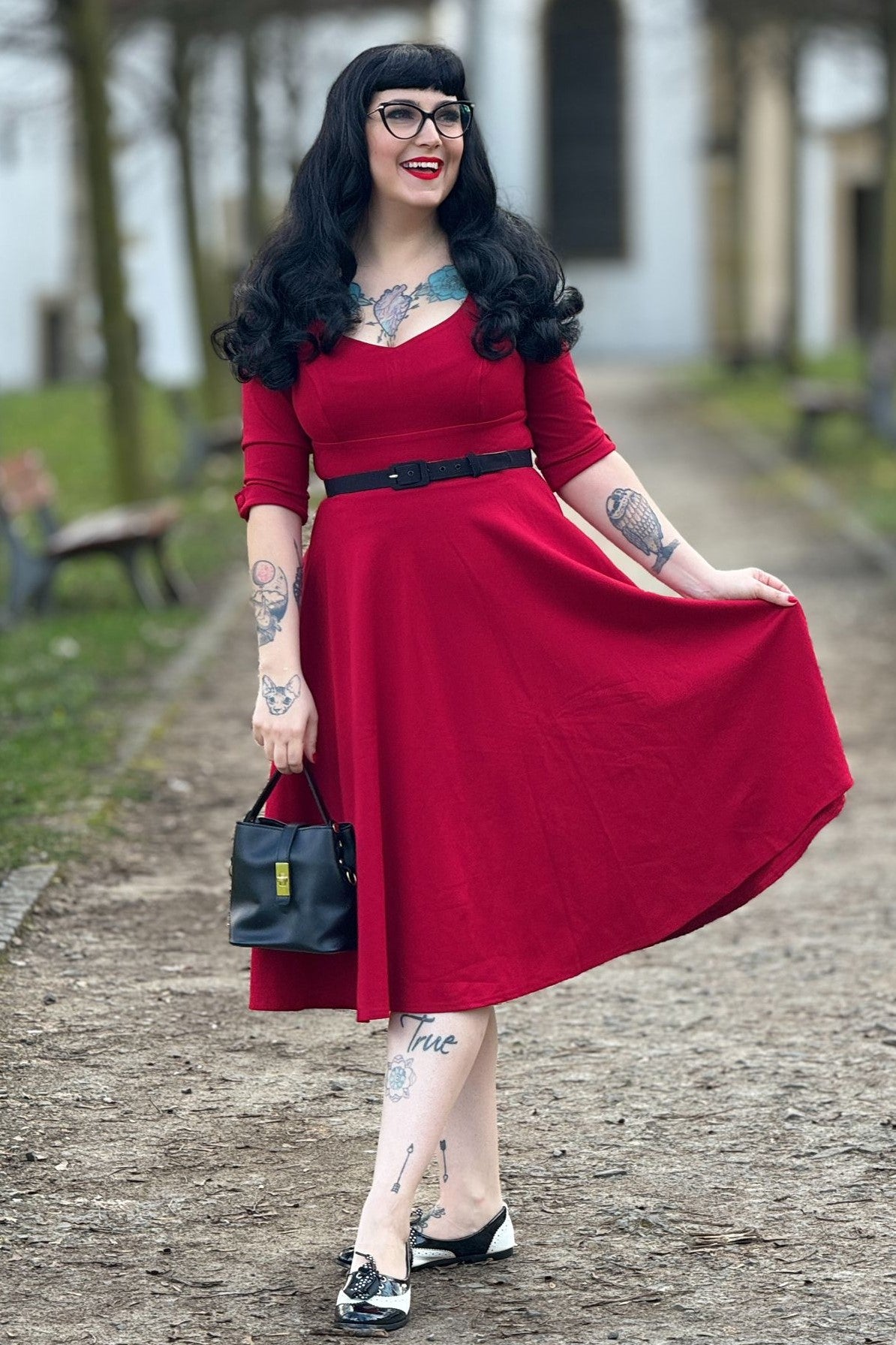 So comfortable & stretchy! Our Scarlette dress is a must have in your wardrobe. This style features a fitted bodice, a sweetheart neckline, 3/4 long sleeves and - of course - our classic a-line skirt with hidden side pockets and a hidden back zip. The pockets are large enough for your mobile phone and purse! Style it for a chic look or pump it up with one of our soft & fluffy petticoats.