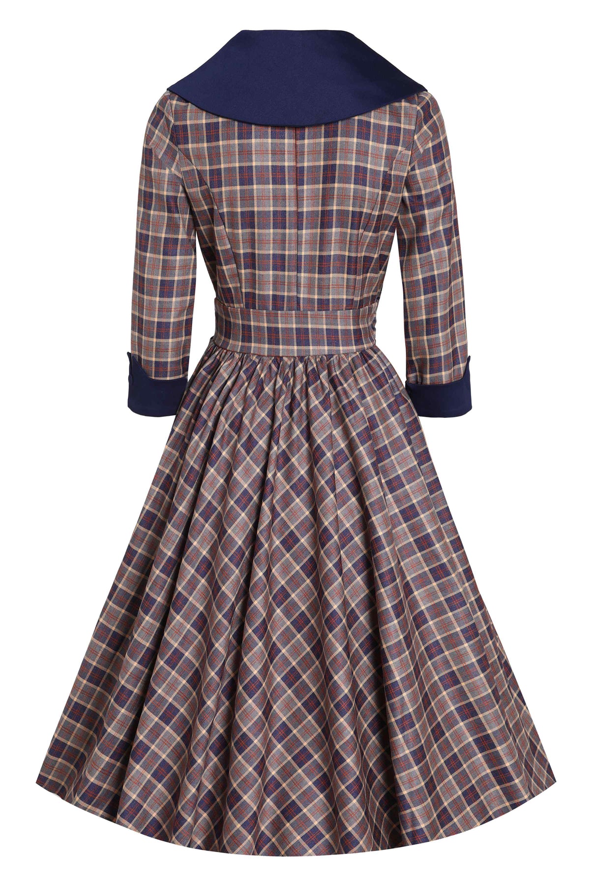 Our Tiffany 50s style swing dress, with flattering three-quarter length sleeves, would look perfect on any occasion! It features a wrap-over style bust, a v-neckline, a retro style collar, a fitted waistband, and a gorgeous full skirt. This flirty vintage-inspired dress is made from lovely soft cotton with stretch and fastens with a concealed zip.