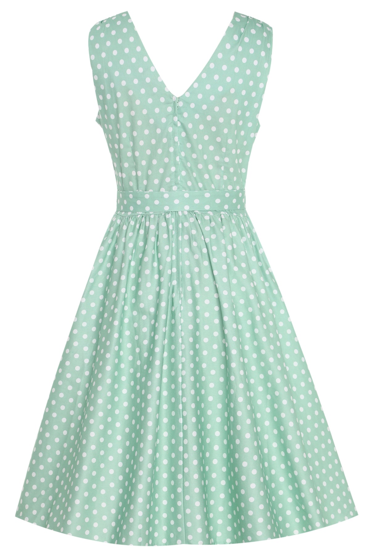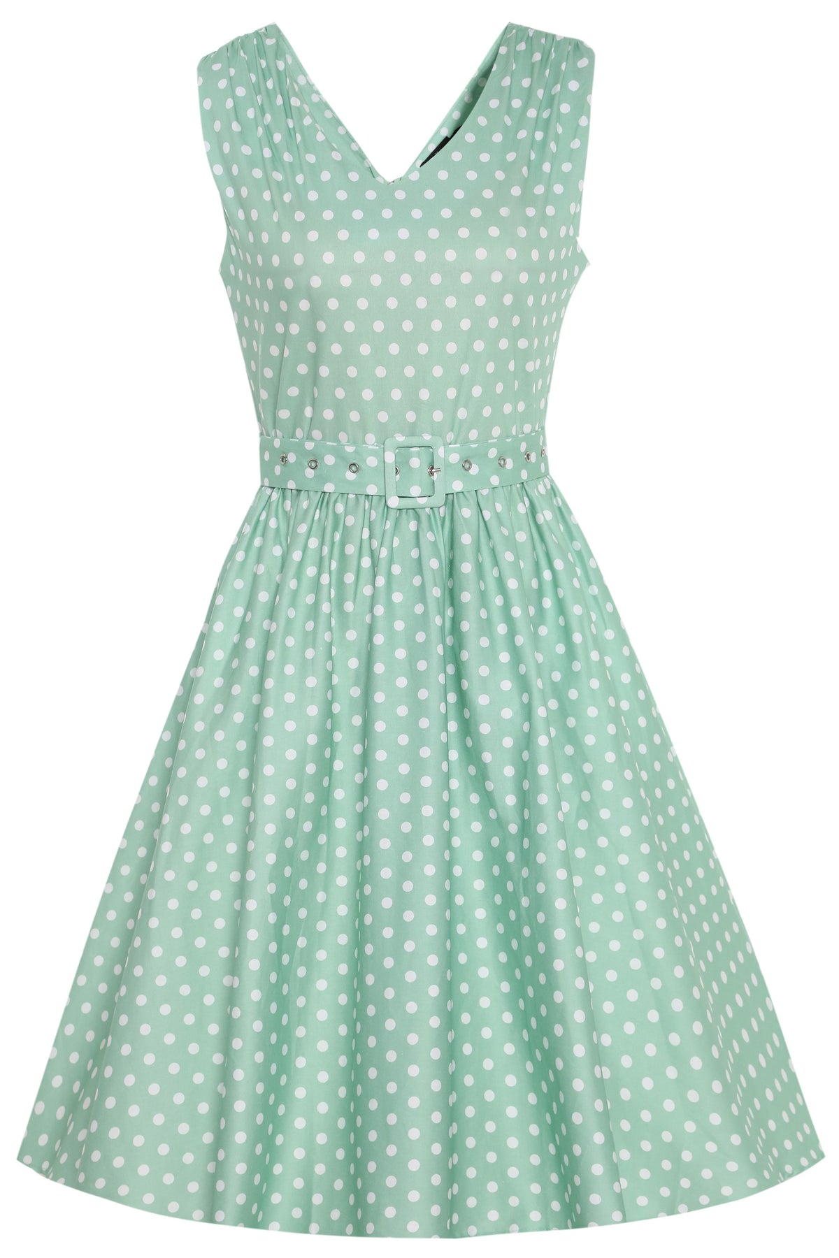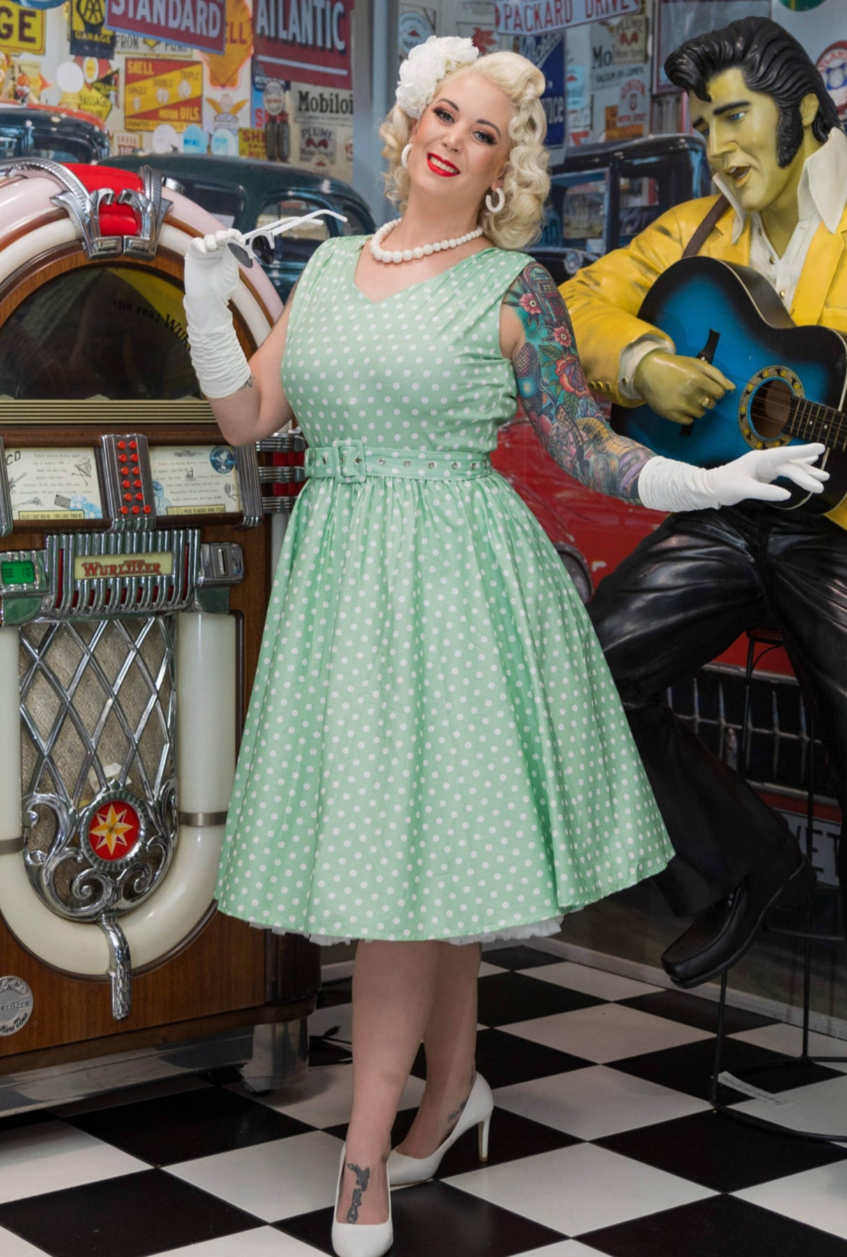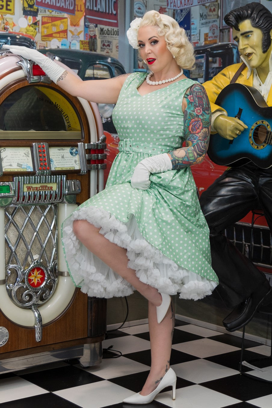 Be transformed into a rebellious pinup girl with our classic 1950s swing dress. This fifties frock has a cute V neckline, a full circle swishing 1950s skirt, and adorable gathers around the shoulders and waist. The dress fastens at the back with a concealed zip and is made from soft cotton with stretch. And guess what? This dress has pockets! You can now carry your essentials with ease without compromising on style.